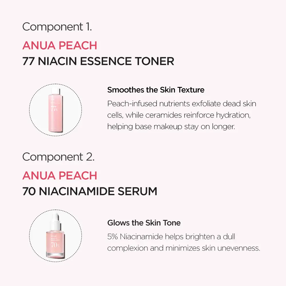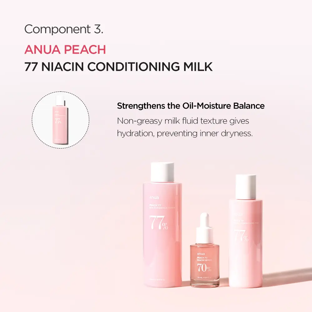 After cleansing, apply Milky Toner with hands or cotton pad. Follow with 2-3 drops of Peach Niacinamide Serum. Finish with Lotion to lock in moisture. Use morning and evening.