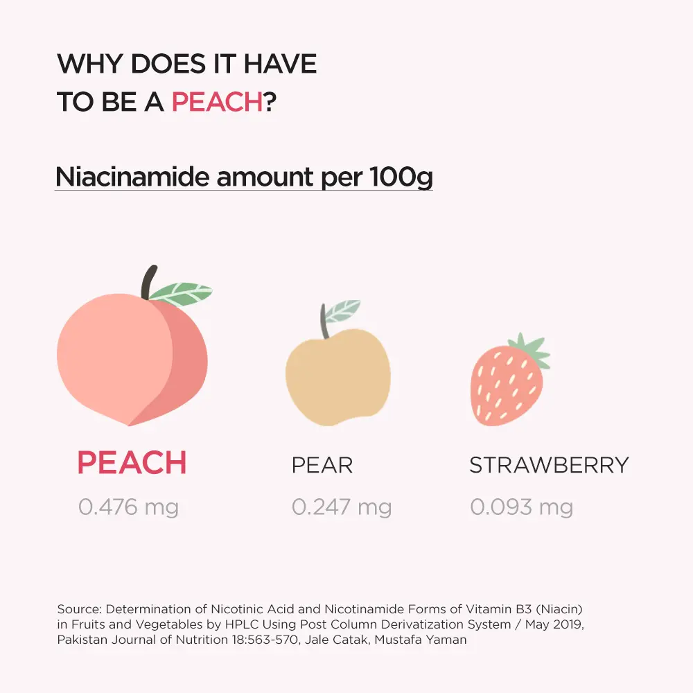 • Peach Niacinamide Serum: 10% Niacinamide brightens dark spots, evens skin tone, and controls excess oil
