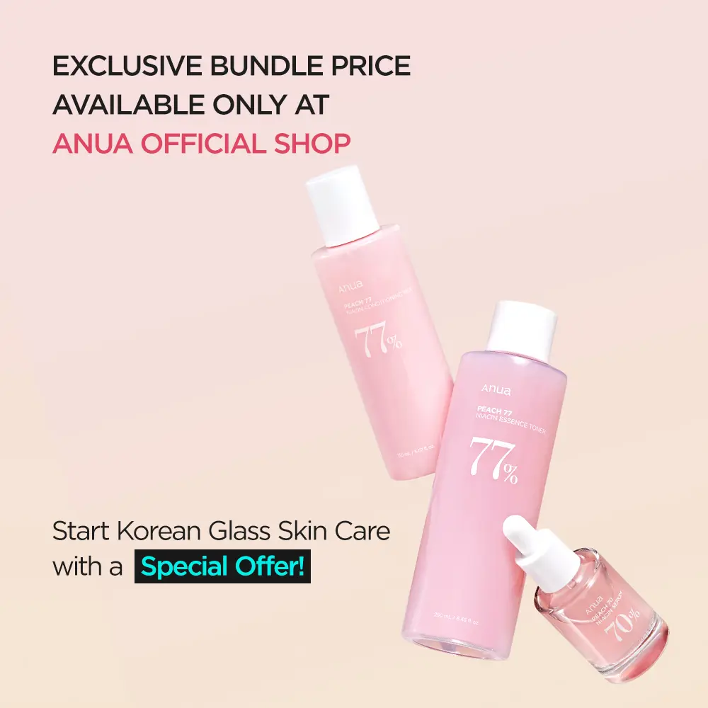 Viral Anua BTS Pink Skincare Set with Milky Toner, 10% Niacinamide Peach Serum & Lotion. A complete 3-step K-beauty routine for glass skin glow.