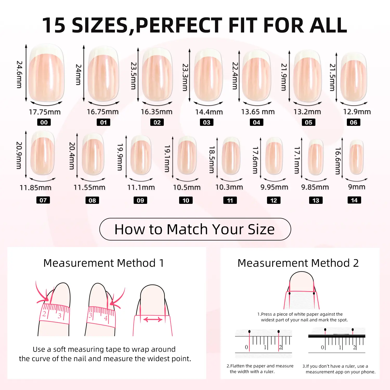Enjoy the convenience of 15 sizes per set for a perfect personalized fit, complete with essential nail application accessories, including nail glue, adhesive tabs, double-sided nail file, cuticle stick, prep pad, and a convenient storage box.