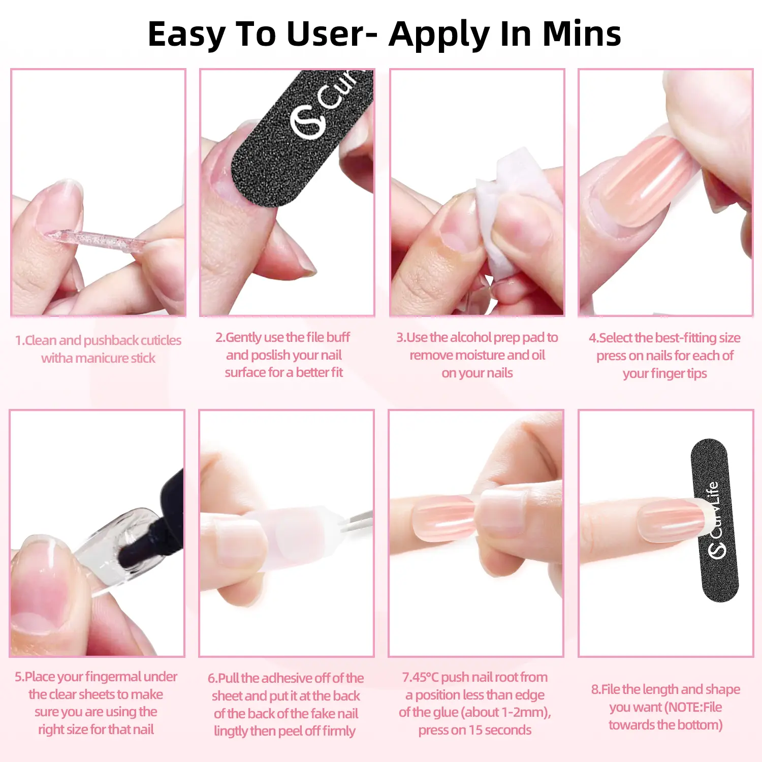 Choose your ideal wear duration, combine nail glue and adhesive tabs for weeks of long-lasting beauty, use glue alone to refresh styles weekly, or select adhesive tabs for quick and elegant transformations, ideal for date nights or special business events.