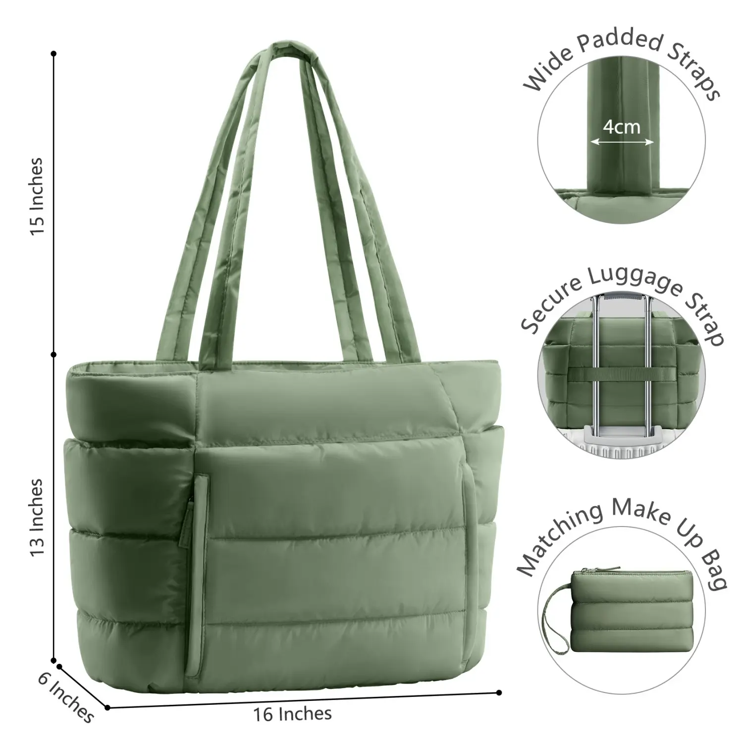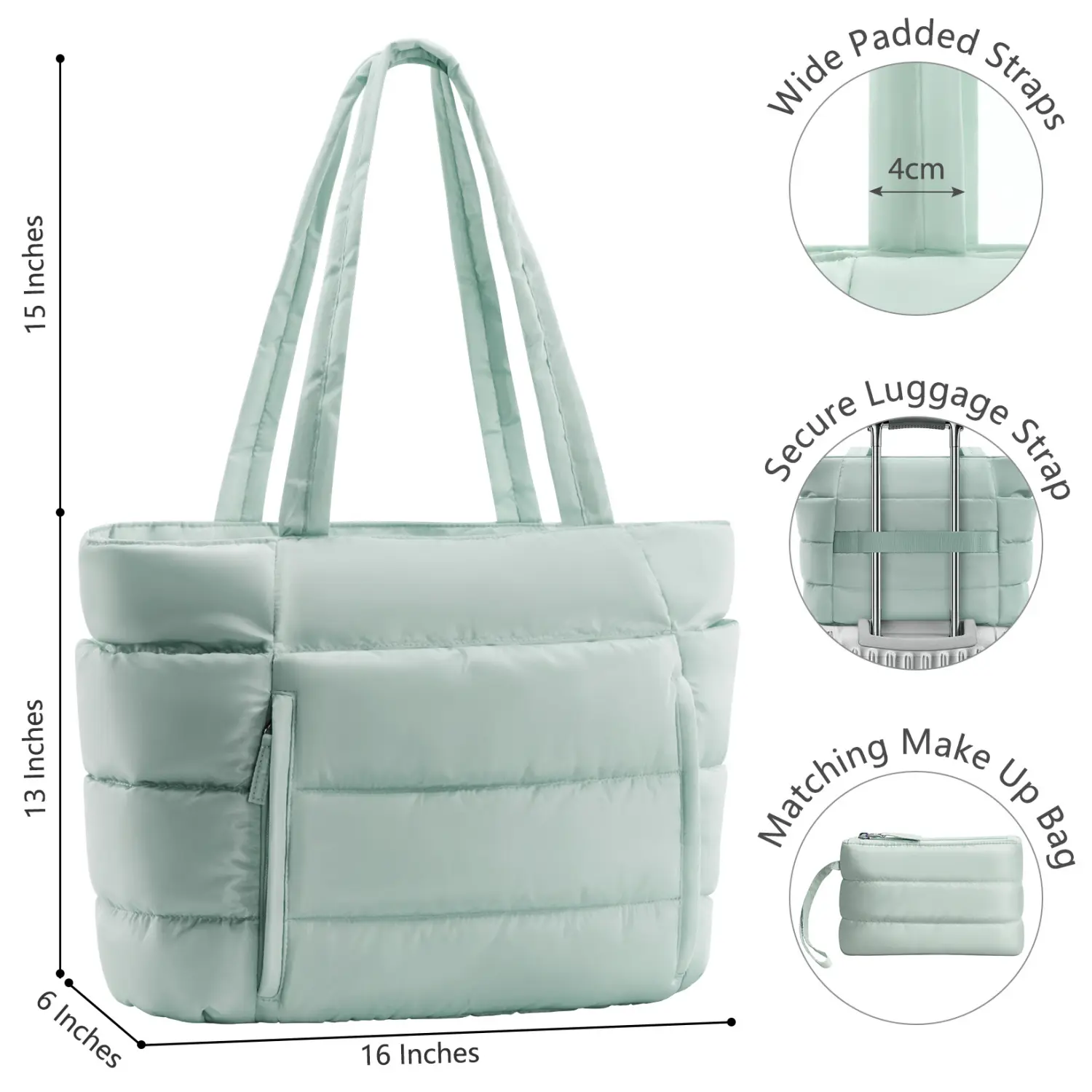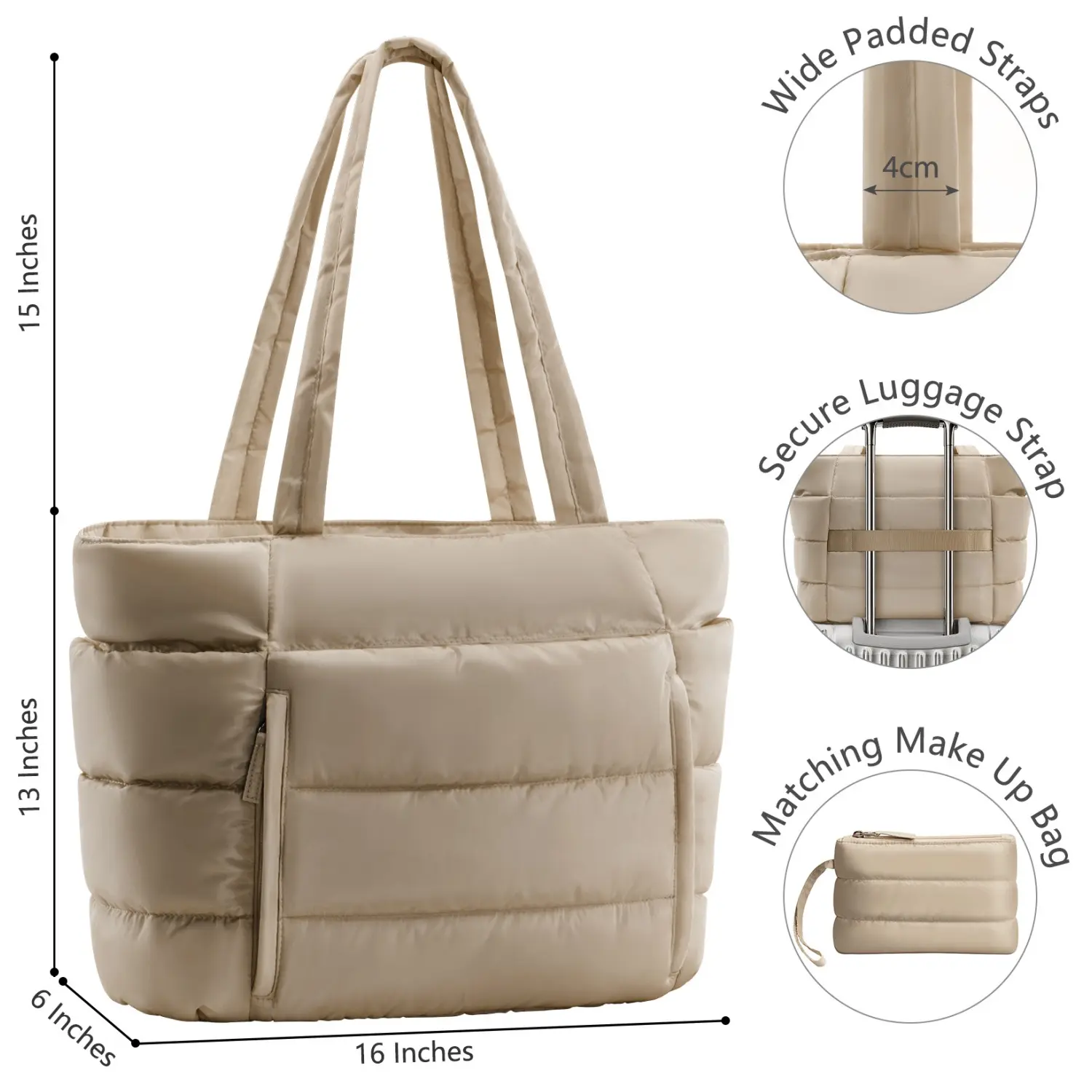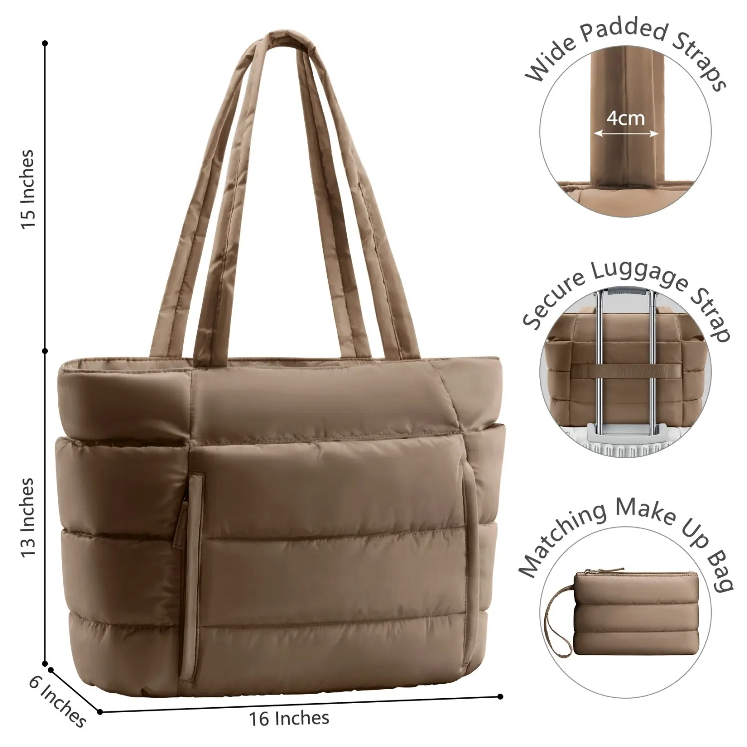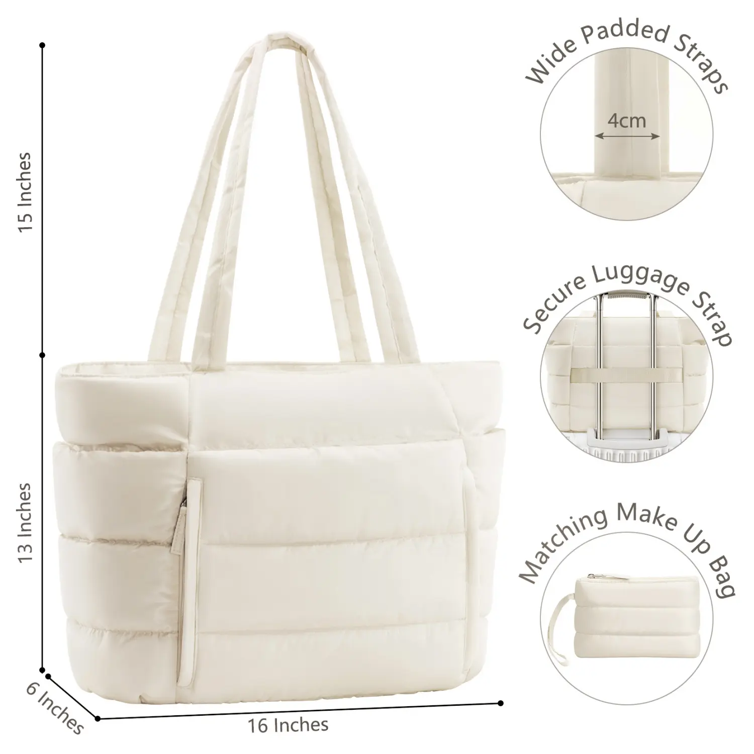The Bagstellar Puffer Tote Bag combines quilted style with serious function. Featuring a 15.6″ laptop sleeve, 40 oz tumbler pocket, and a matching makeup pouch in one lightweight, water-resistant carry-all.