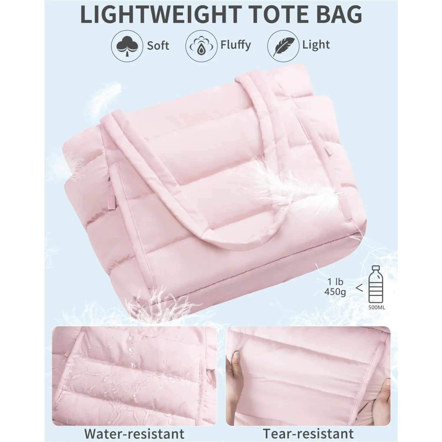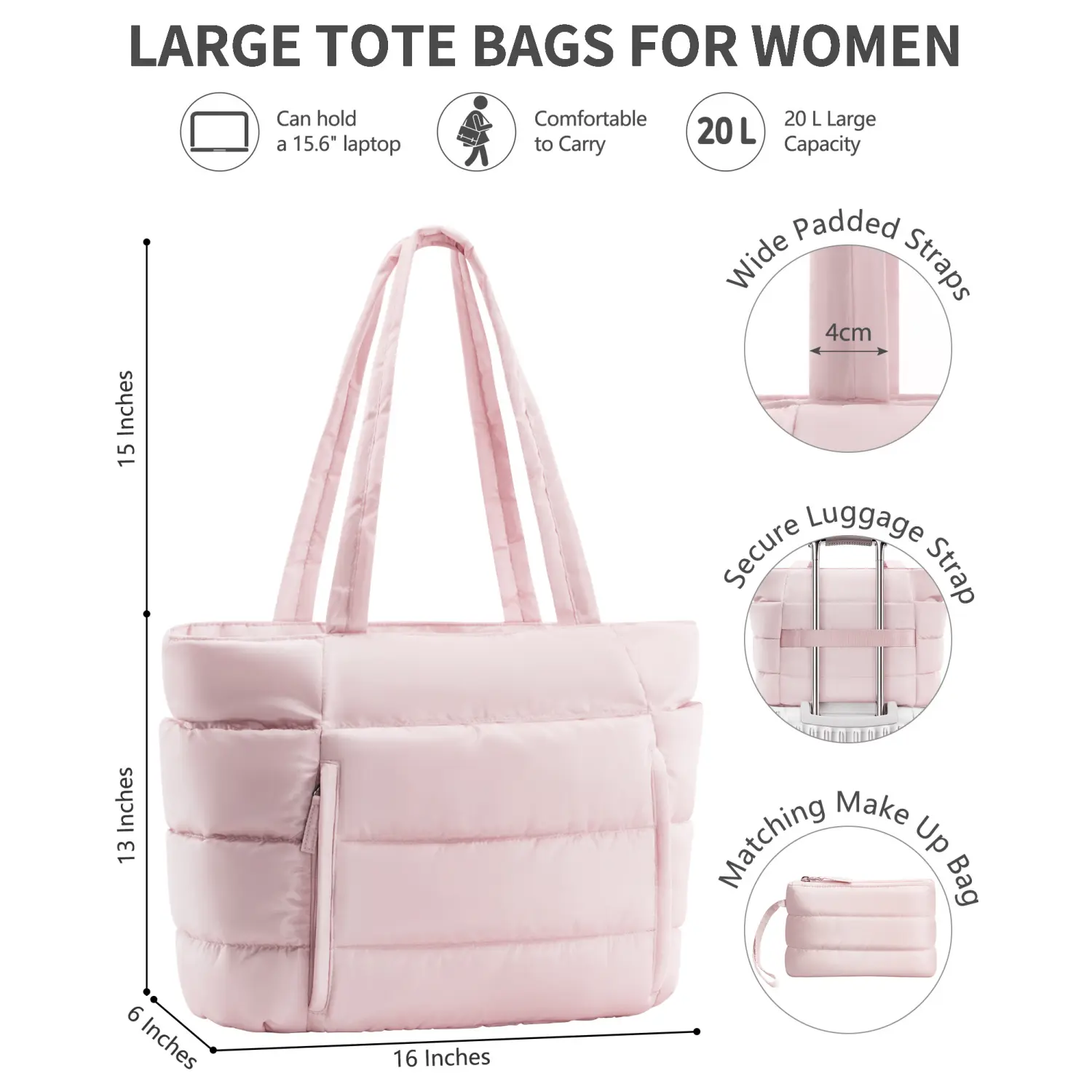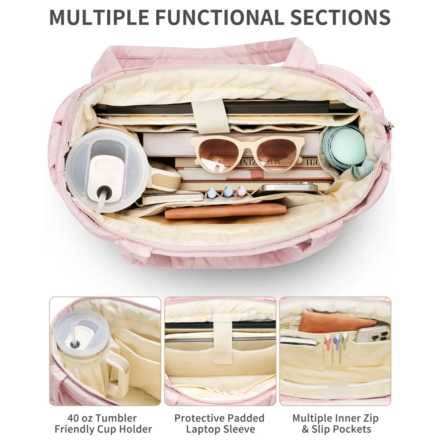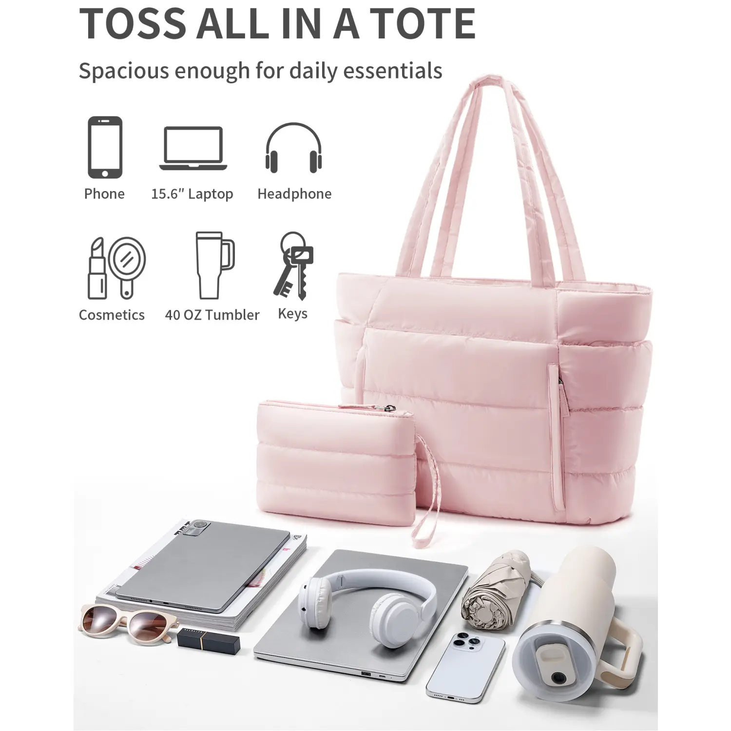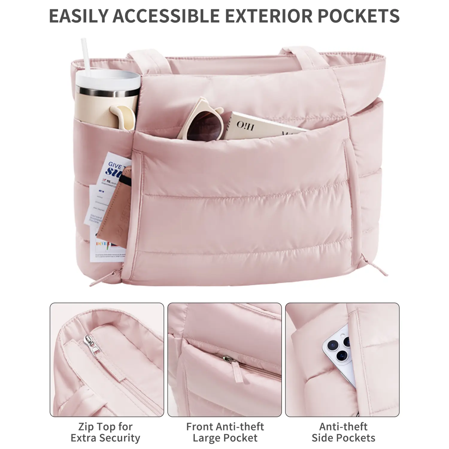 The Bagstellar Puffer Tote Bag combines quilted style with serious function. Featuring a 15.6″ laptop sleeve, 40 oz tumbler pocket, and a matching makeup pouch in one lightweight, water-resistant carry-all.