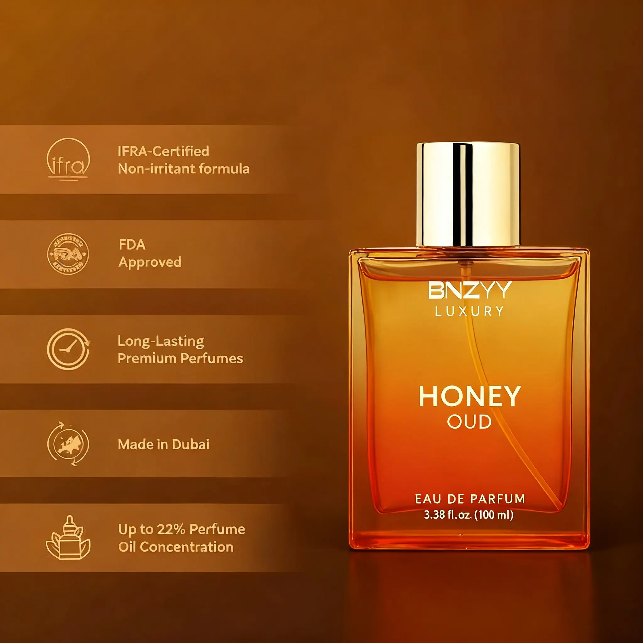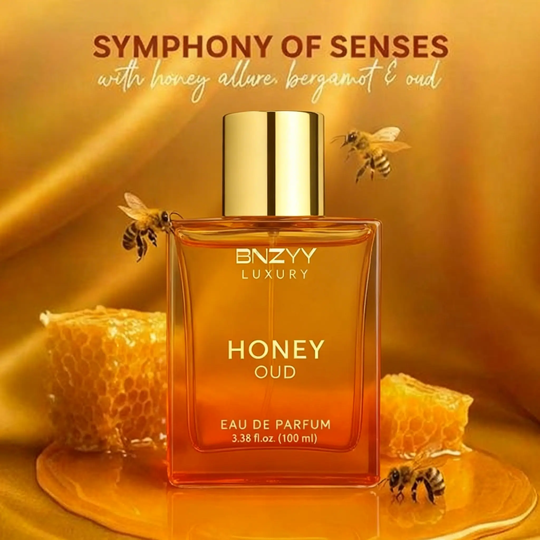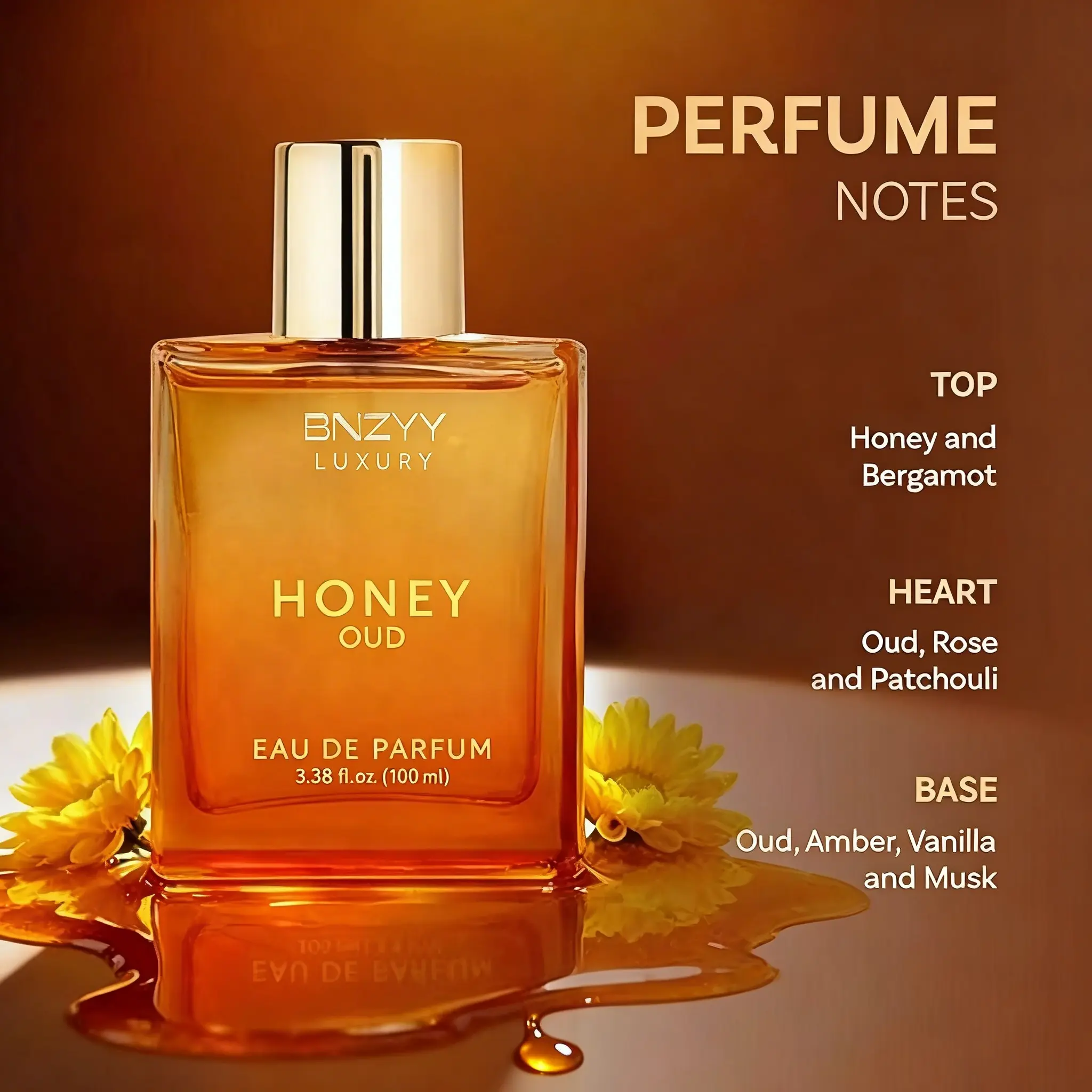 BNZYY Honey Oud Eau de Parfum 100ml(3.4fl oz) | Patchouli Vanilla Bergamot, Floral & Spicy, Clean Vegan Essential Oils