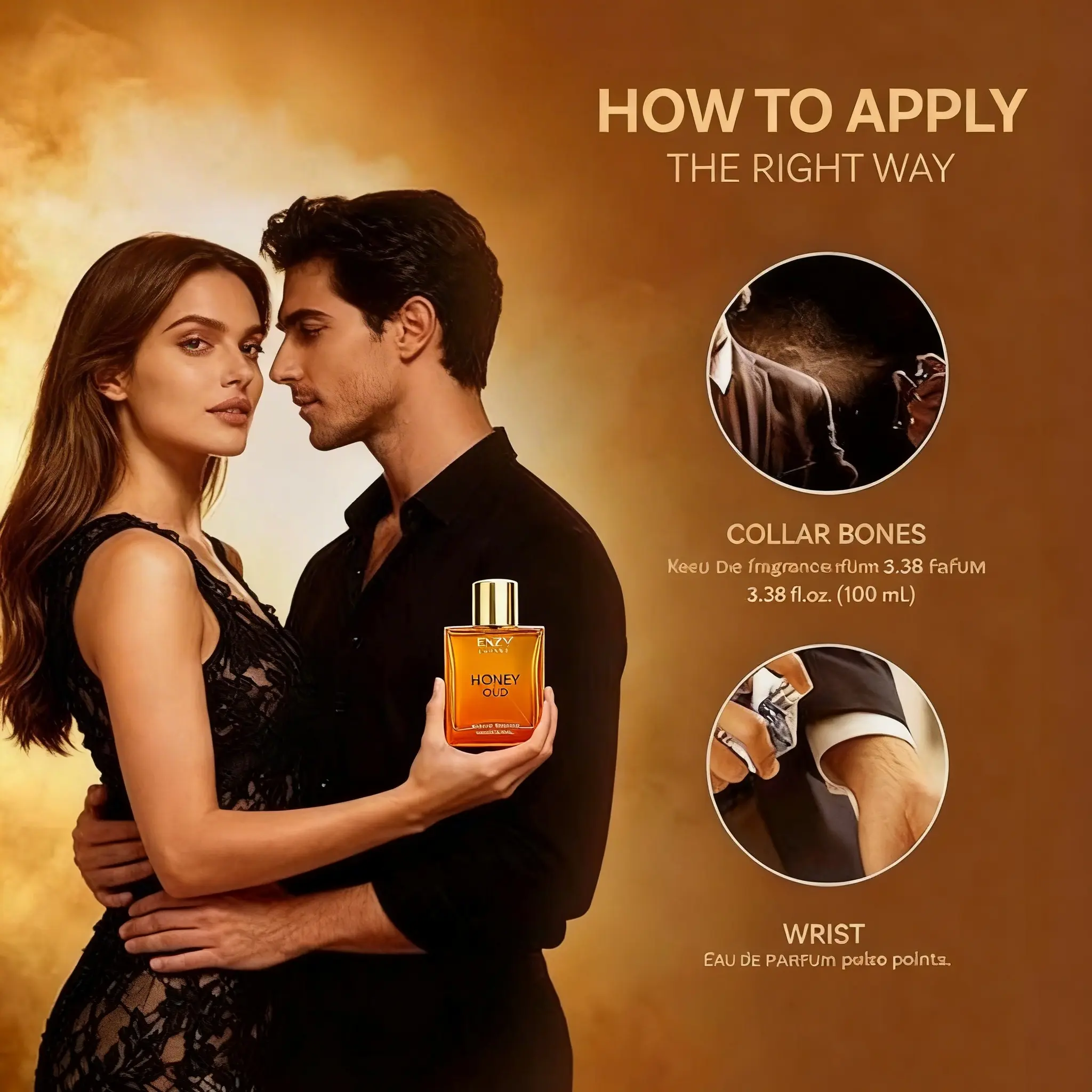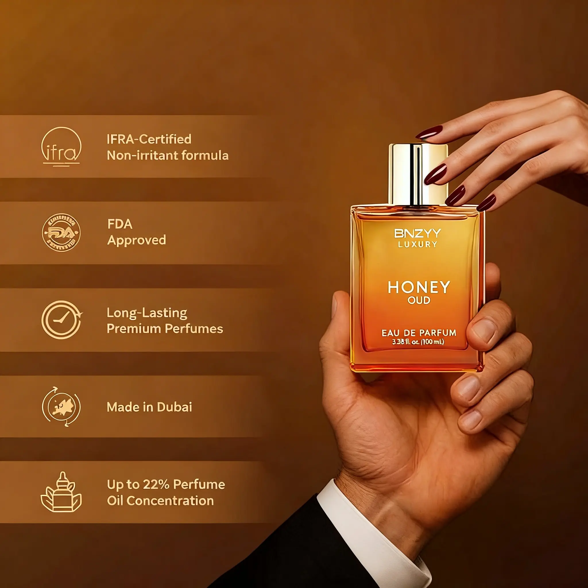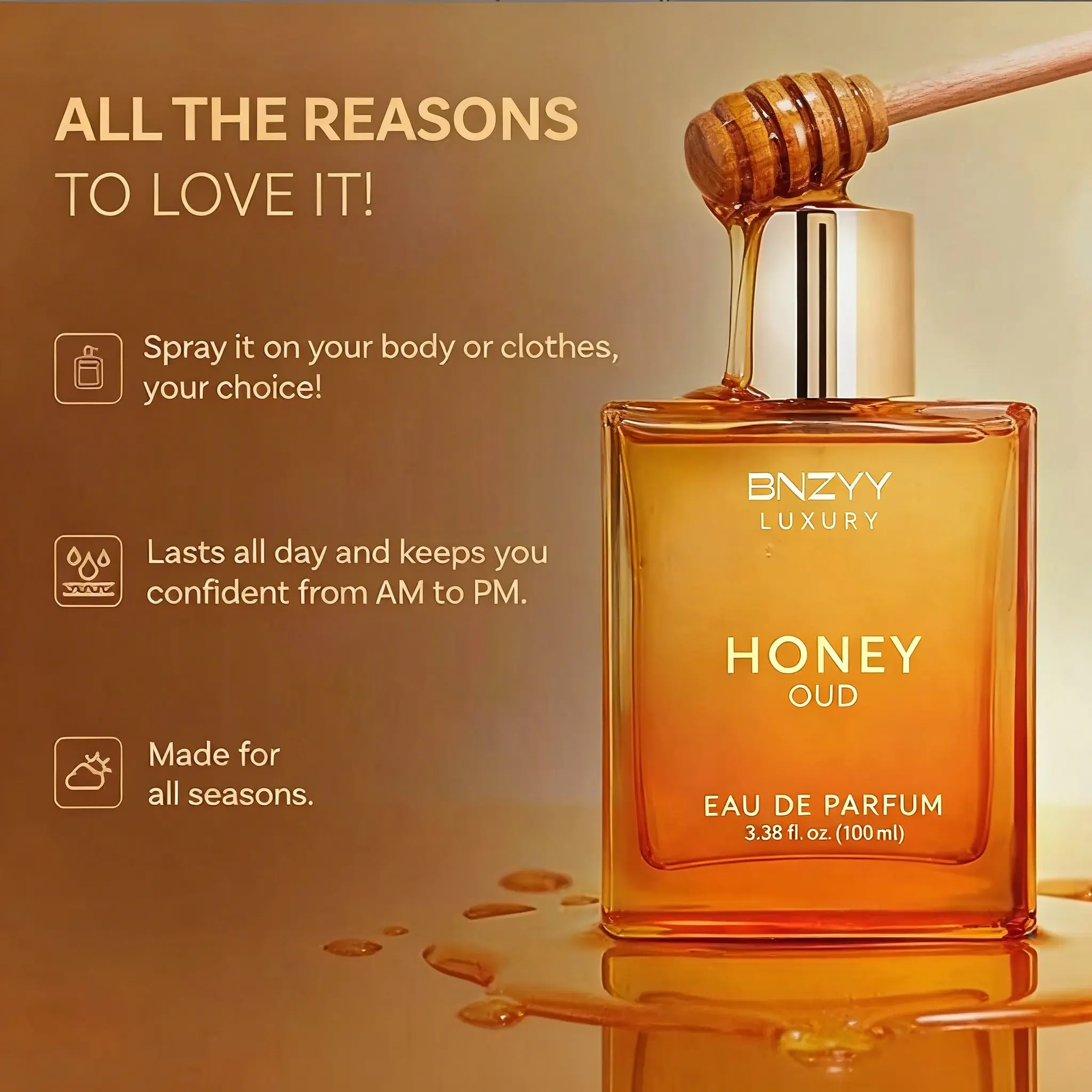 BNZYY Honey Oud Eau de Parfum 100ml(3.4fl oz) | Patchouli Vanilla Bergamot, Floral & Spicy, Clean Vegan Essential Oils