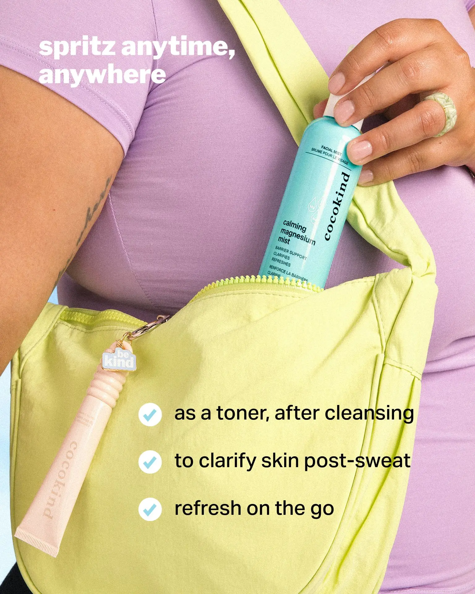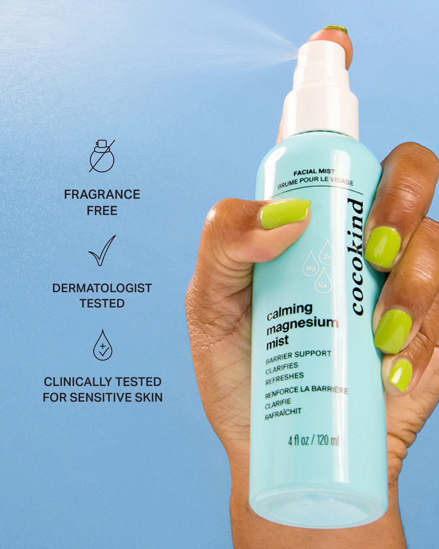 Our calming magnesium-infused facial mist helps reduce visible redness, clarifies breakout-prone skin and supports the moisture barrier to keep your complexion clear and comfortable all day. Spritz the ultra-fine mist anytime to de-stress and refresh – during your routine, over makeup, or post-workout.