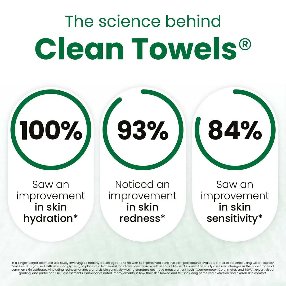 Clean Skin Club Clean Towels® XL Sensitive Skin are ultra-soft, single-use facial towels designed for delicate, reactive, or easily irritated skin. Infused with aloe and glycerin, these towels provide gentle hydration and soothing comfort. Dermatologist approved and clinically tested, they help maintain a hygienic skincare routine while minimizing friction on the skin barrier. Ideal for daily cleansing, makeup removal, and professional use.