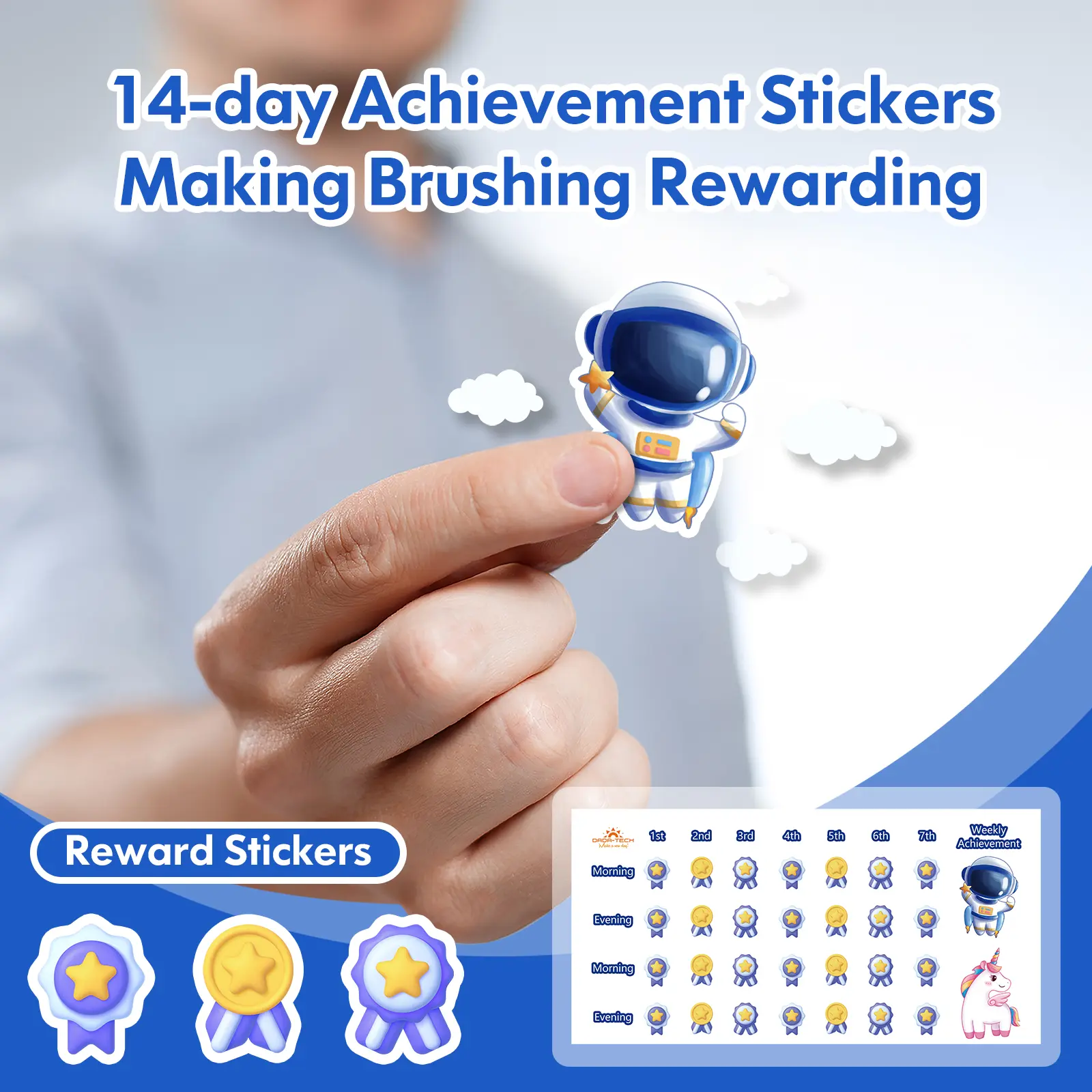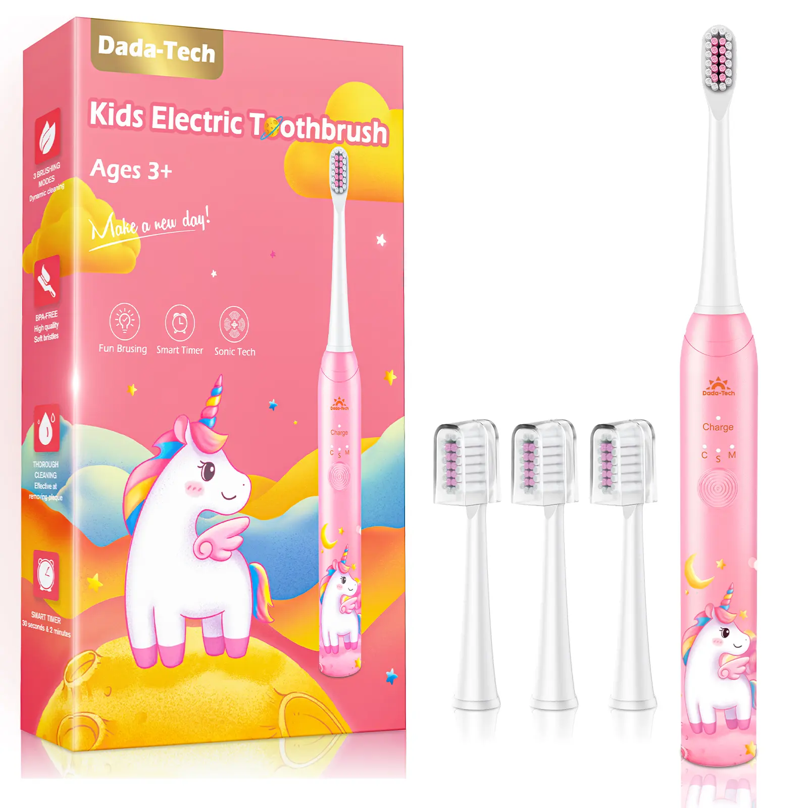 The Dada-Tech Kids Electric Toothbrush uses gentle sonic vibration, a 2-minute smart timer with 30-second quadrant reminders, and 3 kid-friendly cleaning modes to build lasting brushing habits. Rechargeable, waterproof, and BPA-free for ages 3-18.
