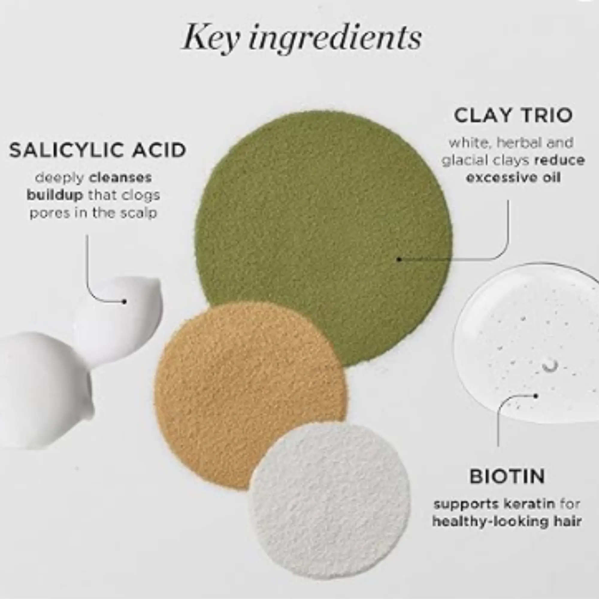 The key ingredients include biotin, salicylic acid and 3 kinds of clay! Biotin is an essential vitamin that helps support keratin for healthy-looking hair. Salicylic Acid helps deeply cleanse buildup that can clog scalp pores, while the Rosemary Oil invigorates the hair and scalp for healthier, thicker, stronger hair.