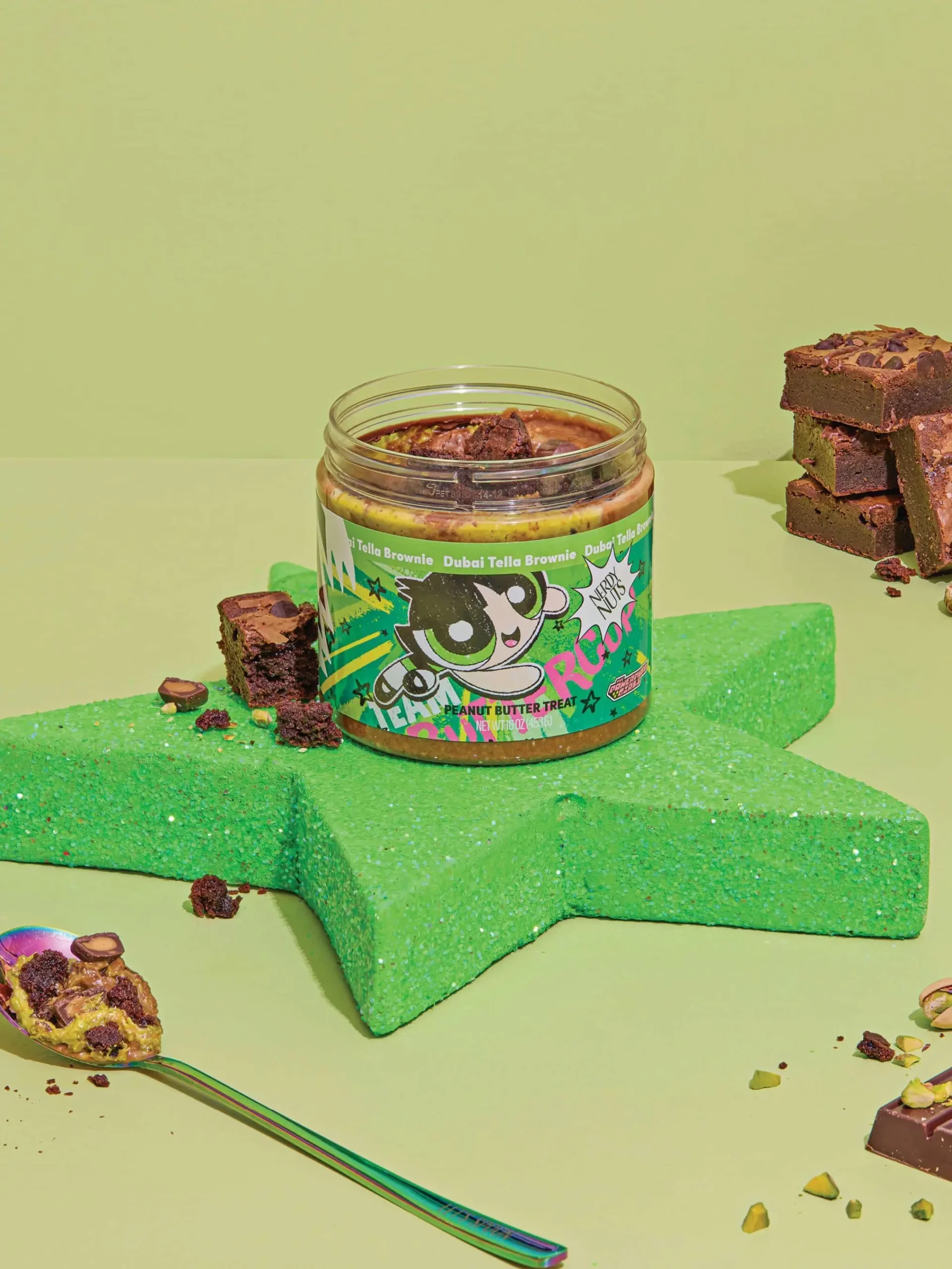 “Smunchy” sweet kataifi milk chocolate peanut butter is swirled with pistachio kataifi cream, chocolate hazelnut spread, brownies, & mini peanut butter cups!
