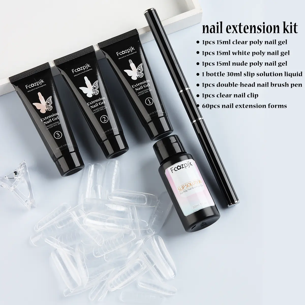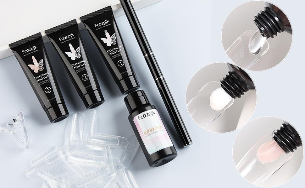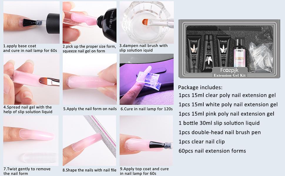 【Package】 You will get 3pcs 15ml poly nail gel:clear,white,pink. The extension kit also includes 1pcs 30ml slip solution liquid,1pcs double-head nail brush pen,1pcs clear clips for poly nail gel,60pcs dual nail forms for extension gel.