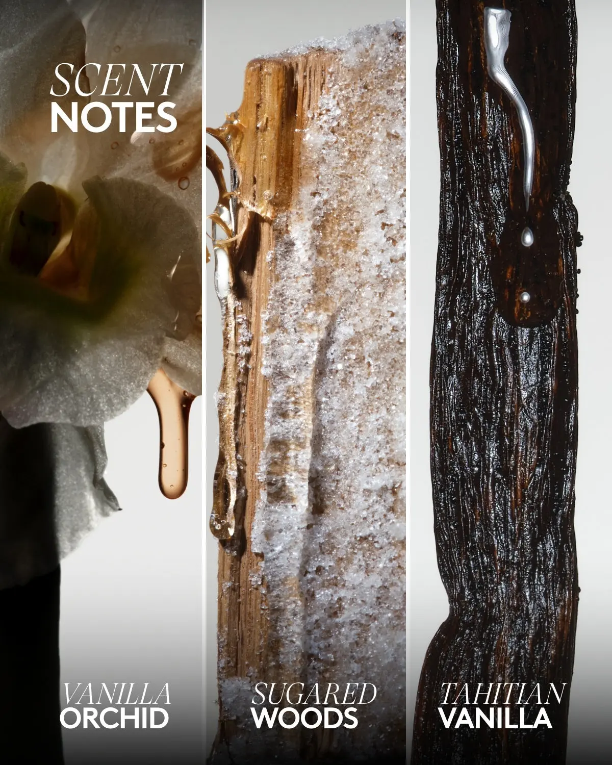Vanilla Flowers: Meet the softer side of sexy. Tahitian Vanilla and Vanilla Orchid combine with Fluffy Musk and Sugared Woods for that just-right mix of sultry + sweet that plays well any time of day.