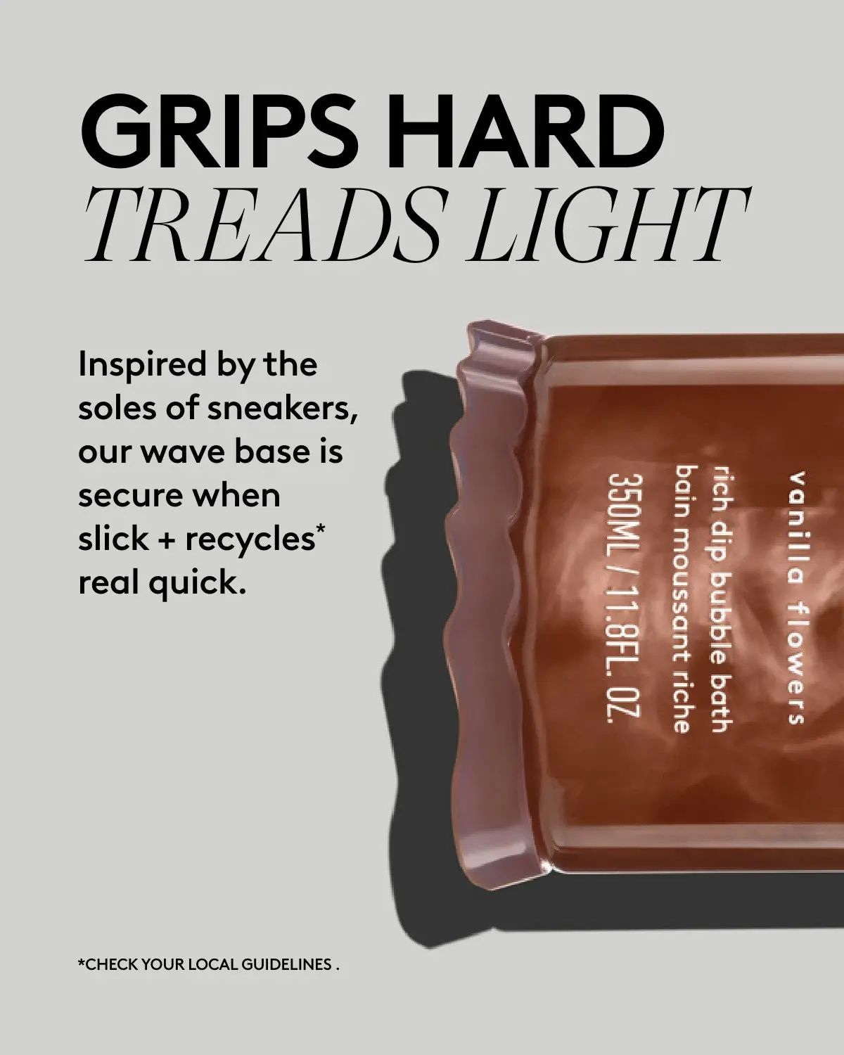Grips hard, treads light, inspired by the soles of sneakers, our wave base is secure when slick + recycles* real quick.The wave base is designed to be removable for easy recycling. If it comes off, simply align the wave designs and pop the base back on.