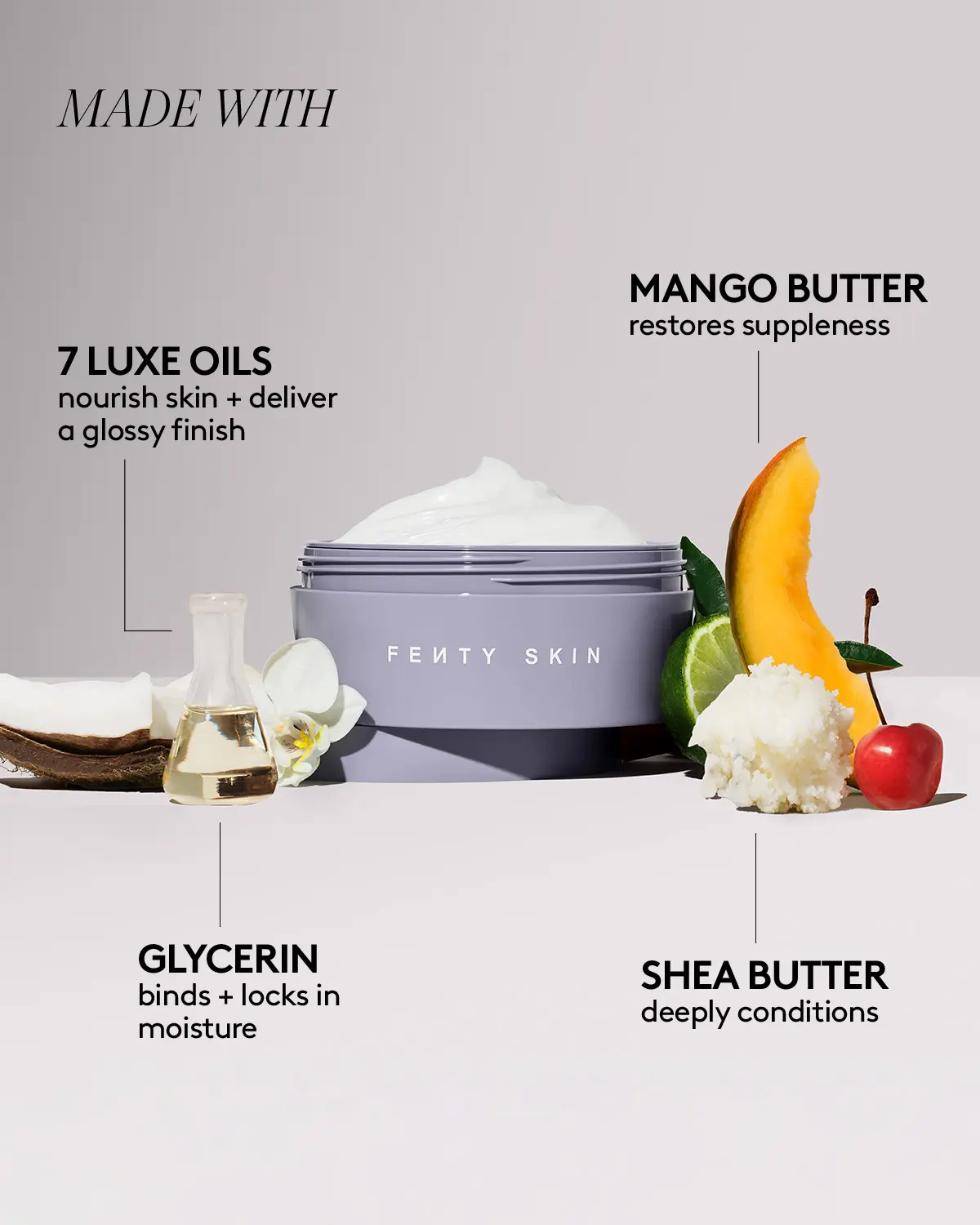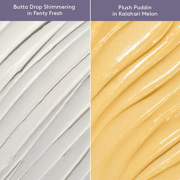 Butta up your body + drip your lips with deep hydration that lasts. Butta Drop Body Cream coats your skin in a delicious, shimmery blend of oils to instantly double your skin’s hydration. Plush Puddin’ Intensive Recovery Lip Mask serves up long-lasting hydration for smoother, bouncier lips.