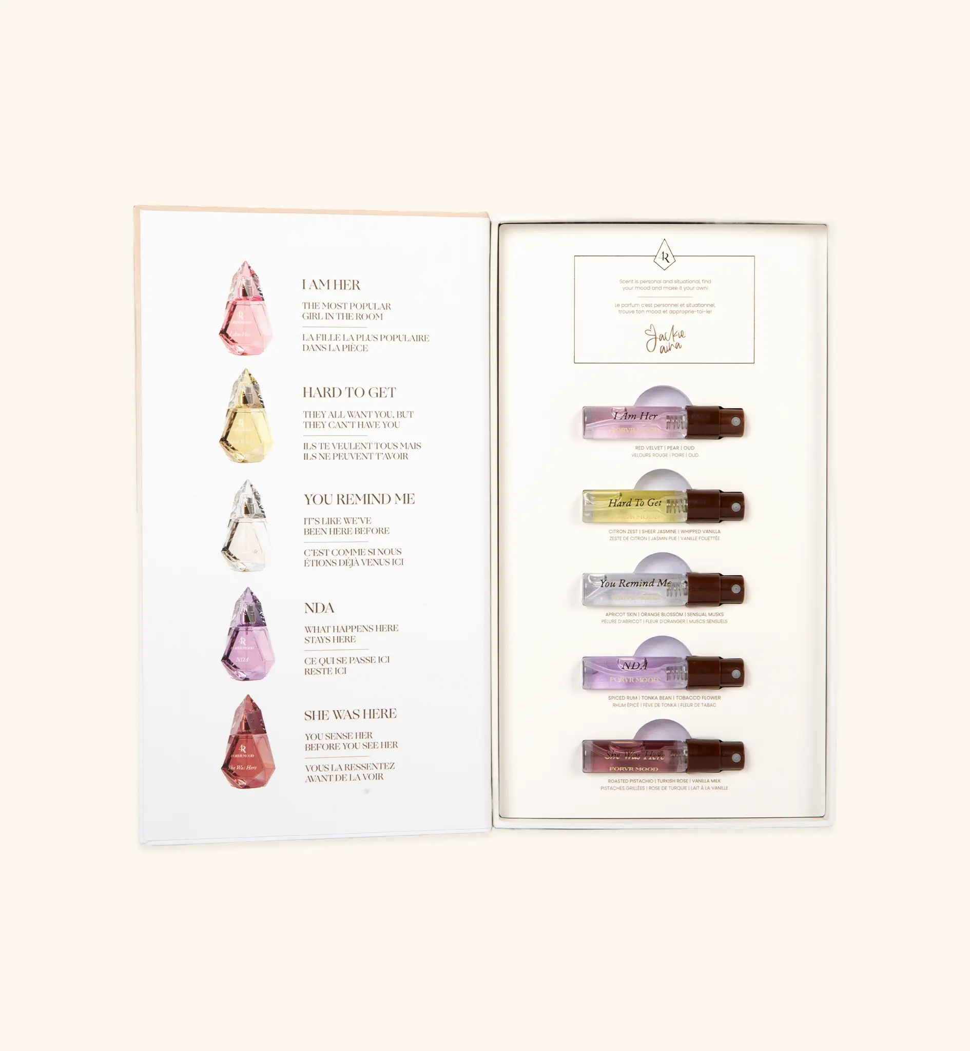 The set contains 3ml fragrances of 1)She Was Here 2)I Am Her 3)Hard to Get 4)You Remind Me 5)NDA.