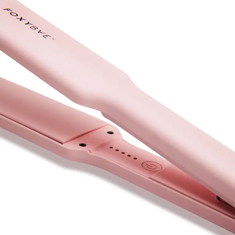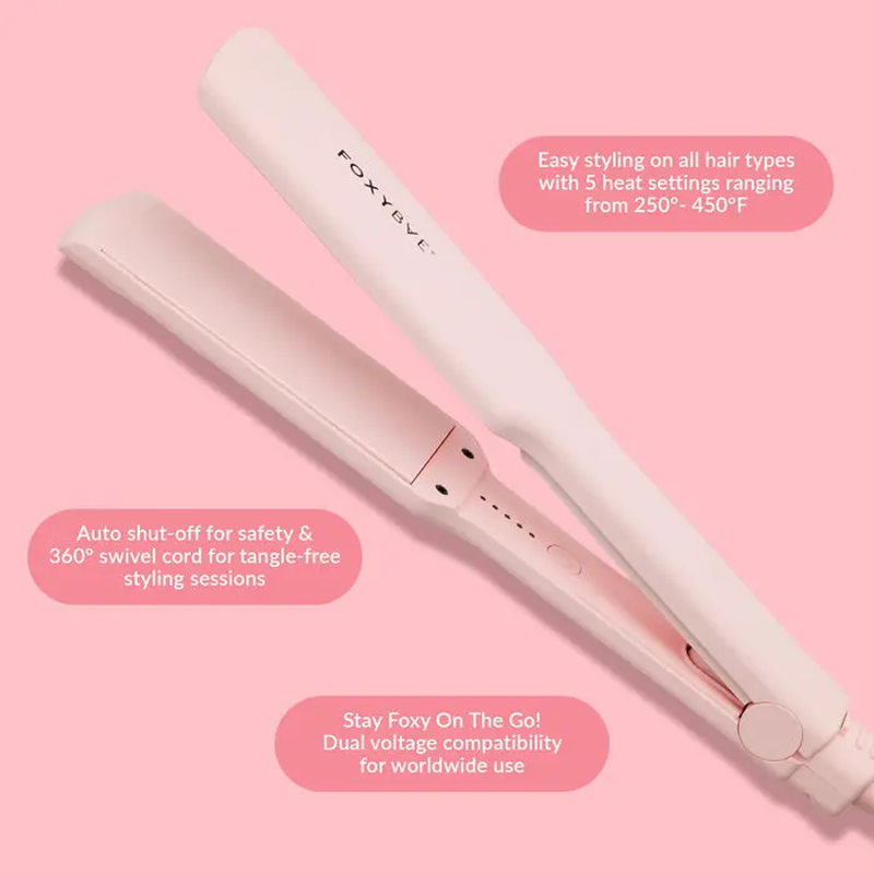 FoxyBae Sleek & Slay 1.75″ wide plate ceramic flat iron. Straightens thick hair in one pass with 450°F heat, dual voltage, and 30-second heat-up time.
