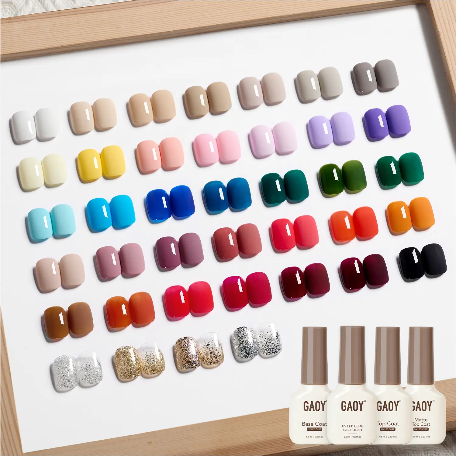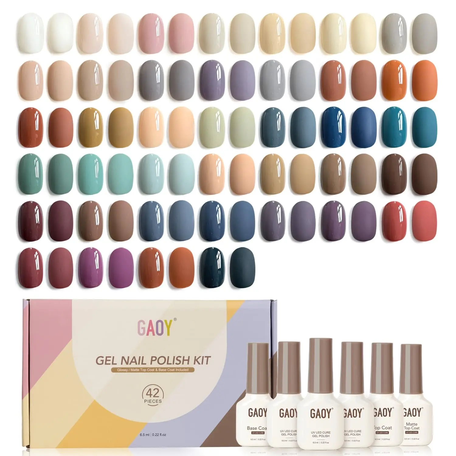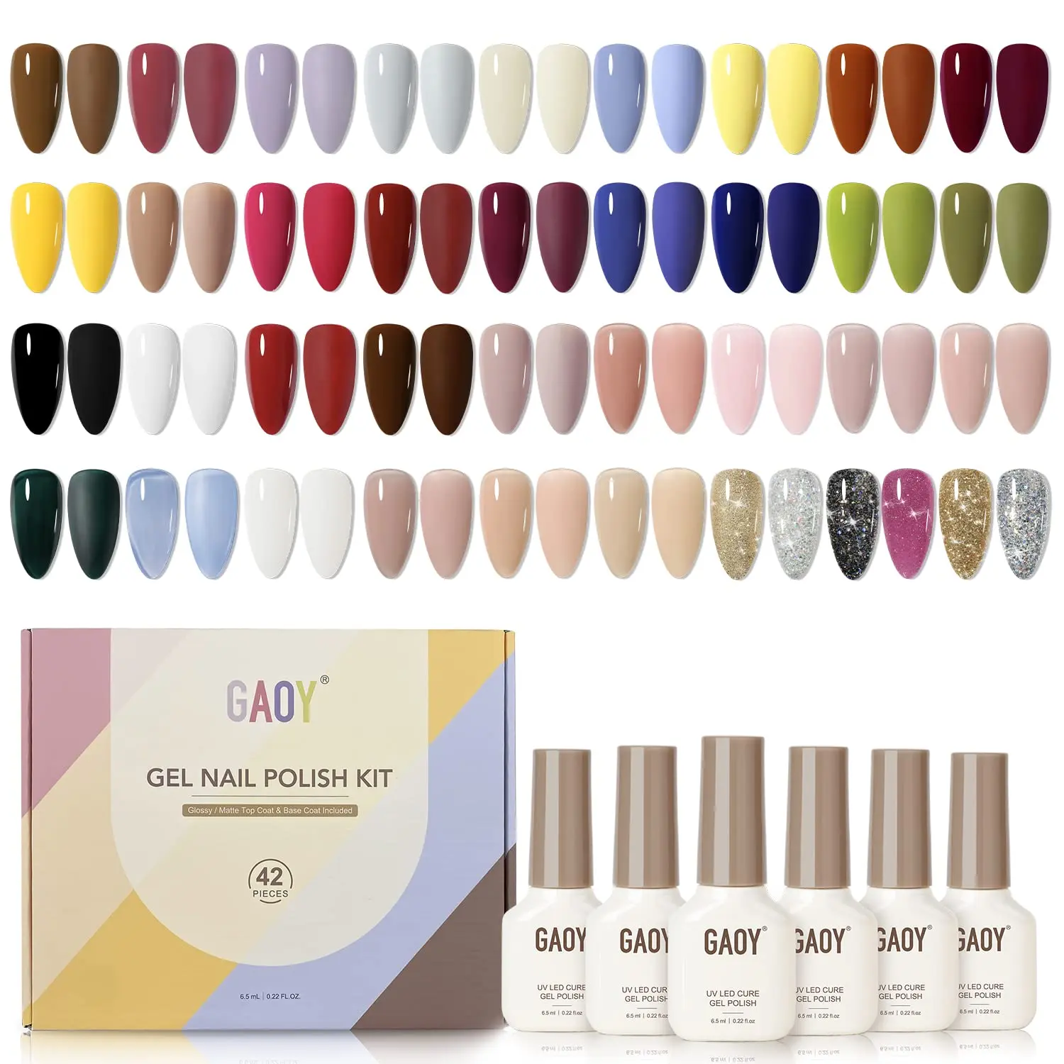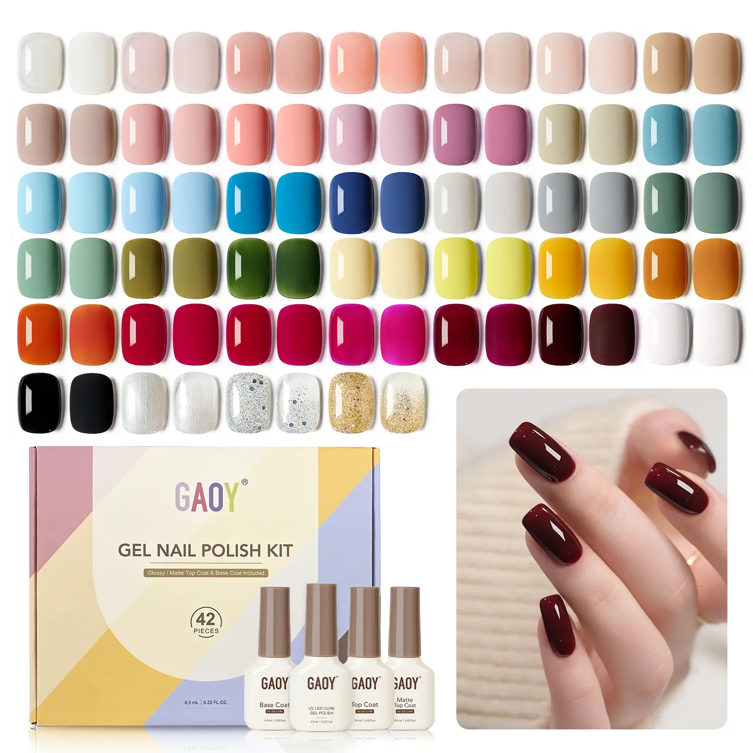 GAOY 42-piece gel nail polish kit with pink, white, red, and nude shades plus matte and glossy top coats. Complete at-home gel collection for every occasion.