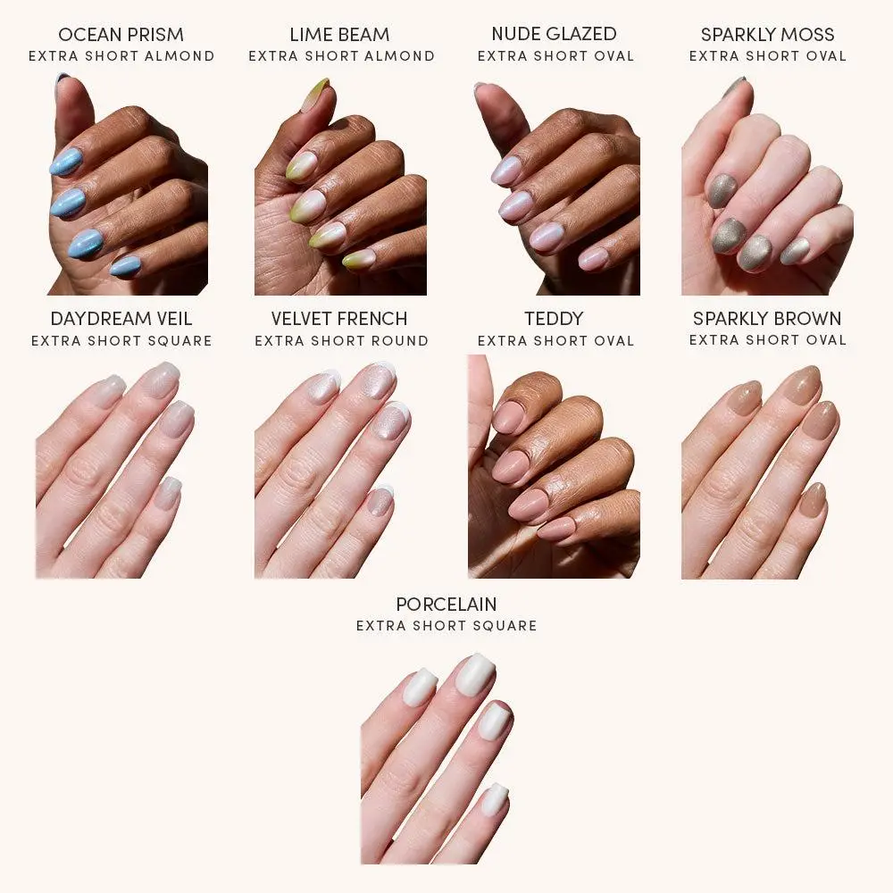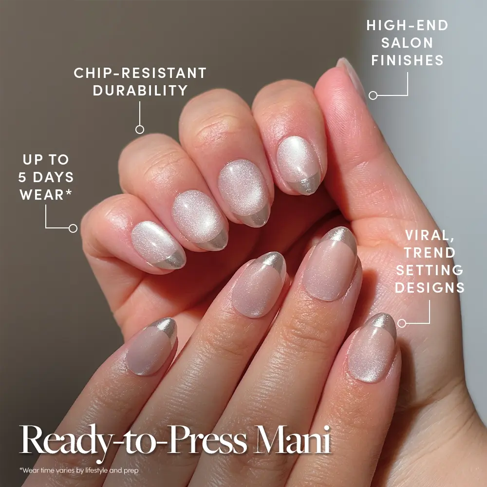 Get our fastest salon-quality mani yet. The Quick Press Mani Collection features a range of no-glue press-on nail styles designed for effortless application in just 5 minutes.* With built-in adhesives and our extra short lengths, these nails deliver a comfortable fit and durable wear that lasts up to 5 days.*