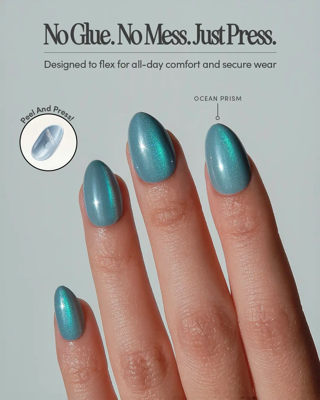 • Ocean Prism: Extra short almond nails in a dreamy blue-grey shade with a reflective glazed finish.