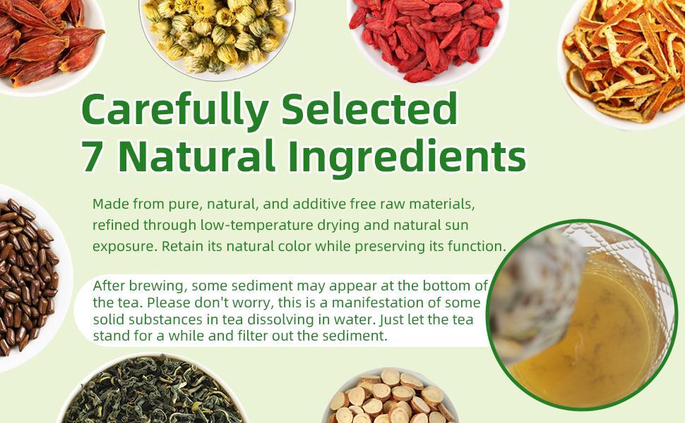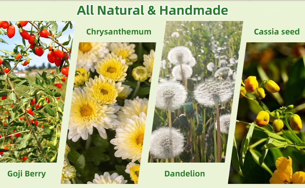 【Pure Natural Herbs】7 kinds of carefully selected herbs: Goji berries, chrysanthemum, dandelion, cassia seeds, orange peel, gardenia and licorice. Scientific proportioning, natural drying, without any additives, safe and natural.