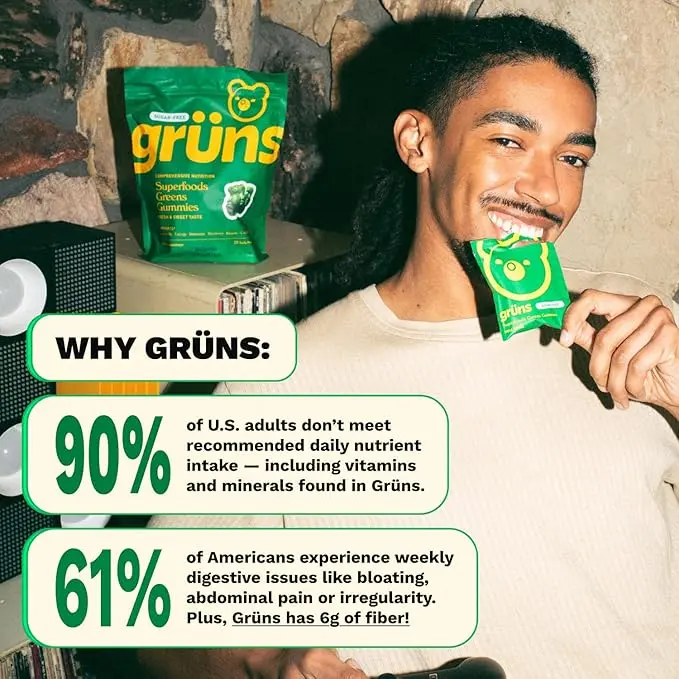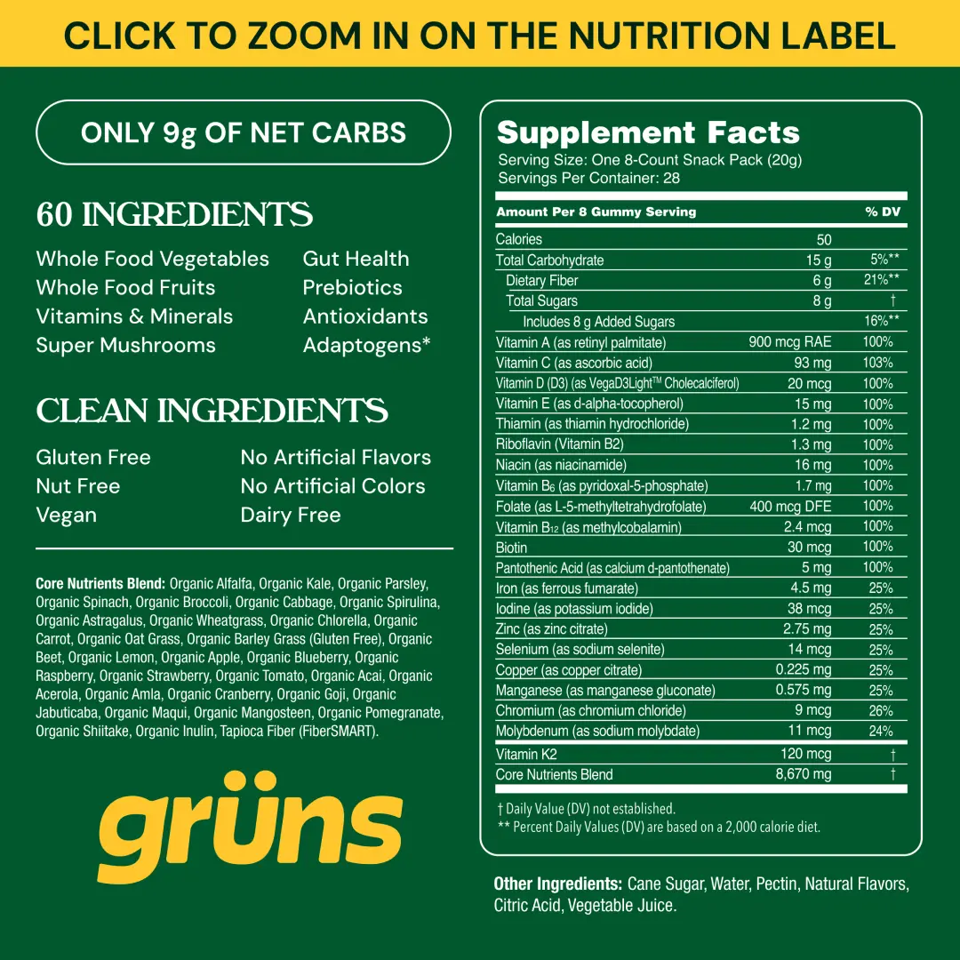 You have nutrition gaps. Grüns fills them. Comprehensive daily nutrition in each life-hack snack pack of gummies. With 60 nutrient-dense ingredients, meeting your daily nutrient needs, supporting gut health, and promoting whole-body vitality has never been so easy.