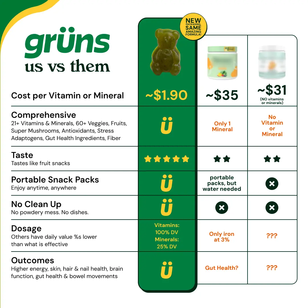 1. Comprehensive: Nutrition that works. Grüns replaces handfuls of health products at a fraction of the cost.