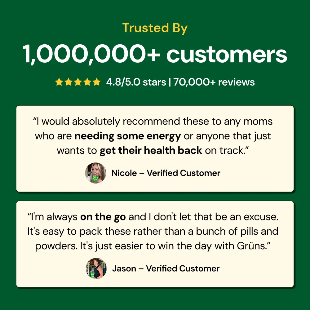 The benefits of Grüns make up a long list. Try saying all of this with one breath of air: gut health, immunity, brain health, cognitive focus, energy, thicker hair and nails, healthier skin, anti-aging, stress relief, recovery, strength building, detoxification, better sleep, prenatal health, and overall health.