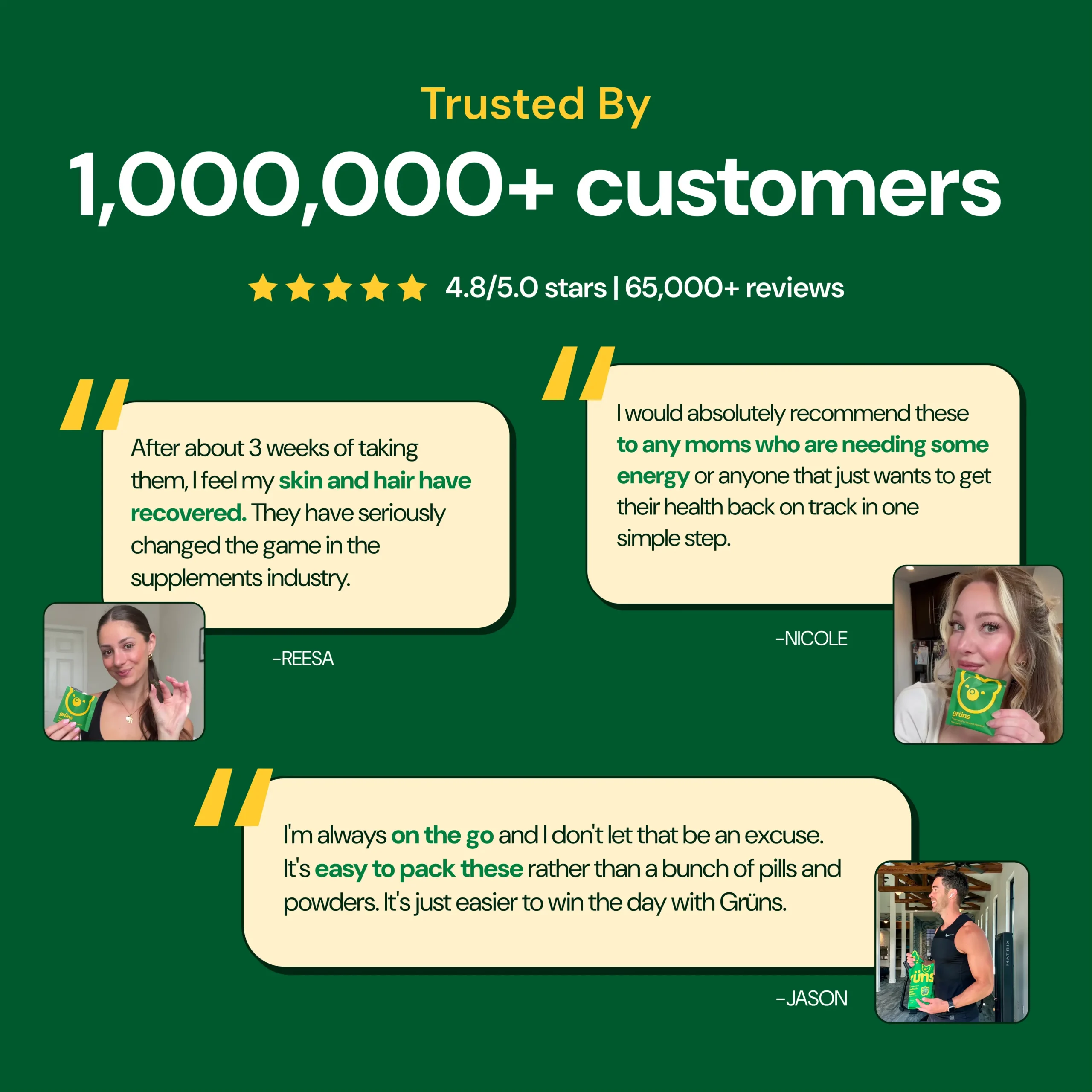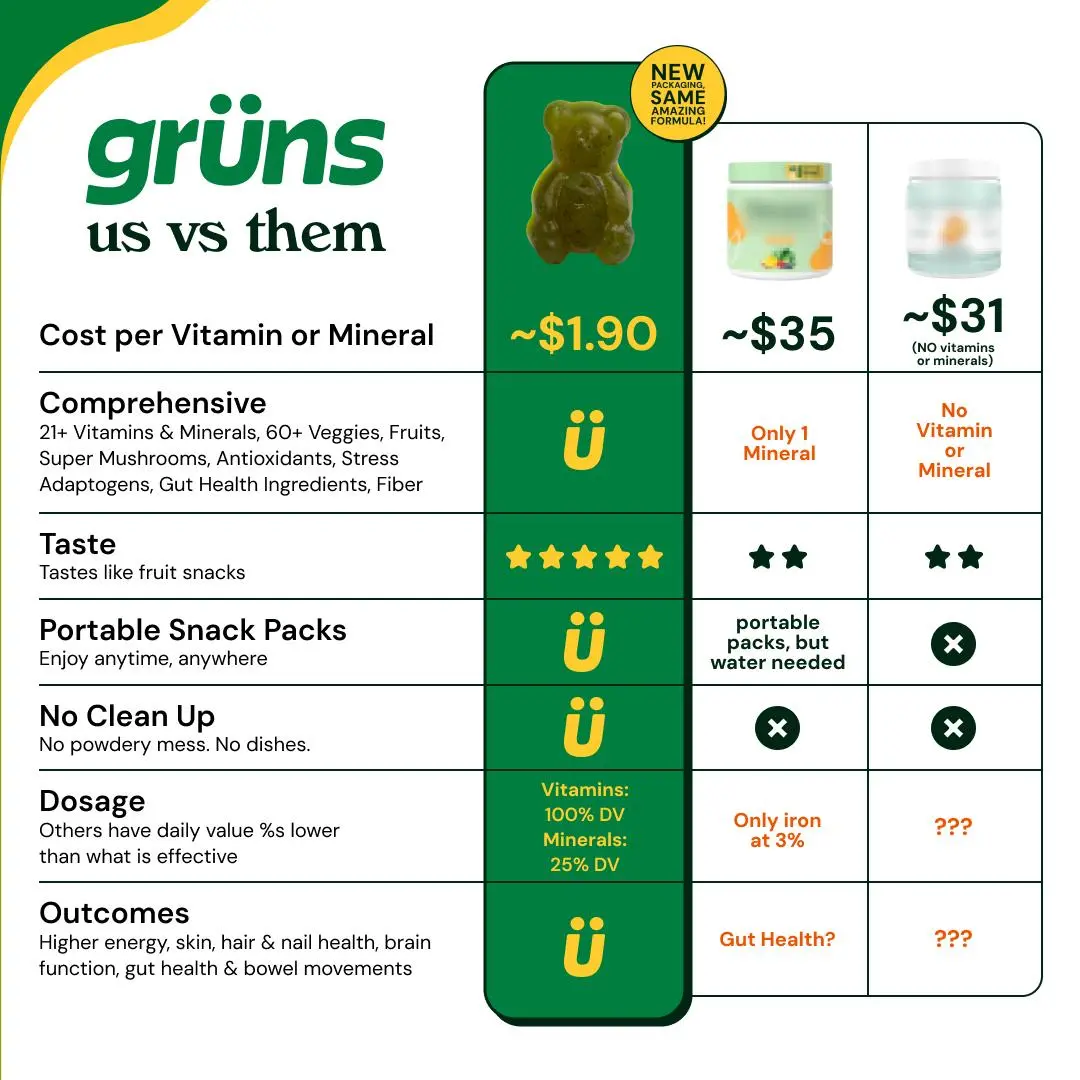 You have nutrition gaps. Grüns fills them. Comprehensive daily nutrition in each life-hack snack pack of gummies. With 60 nutrient-dense ingredients, meeting your daily nutrient needs, supporting gut health, and promoting whole-body vitality has never been so easy.