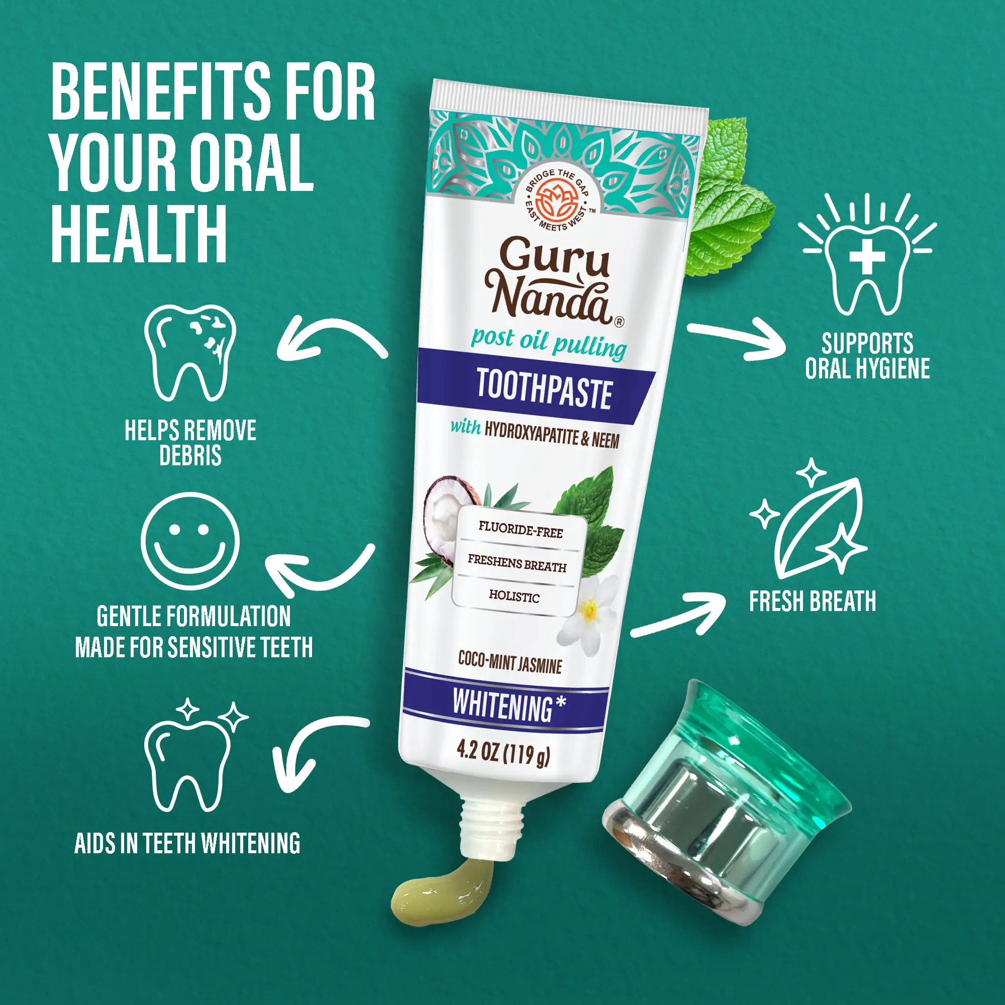 What if the key to a brighter, stronger, more resilient smile was hiding in ancient Ayurvedic tradition and cutting-edge enamel science at the same time? GuruNanda’s Hydroxyapatite Neem Whitening Toothpaste is the rare formula that bridges both worlds. Delivering the proven remineralizing power of hydroxyapatite, the time-honored gum-support of neem, and the luxurious CocoMint Jasmine flavor that makes every brush feel like a ritual rather than a routine.