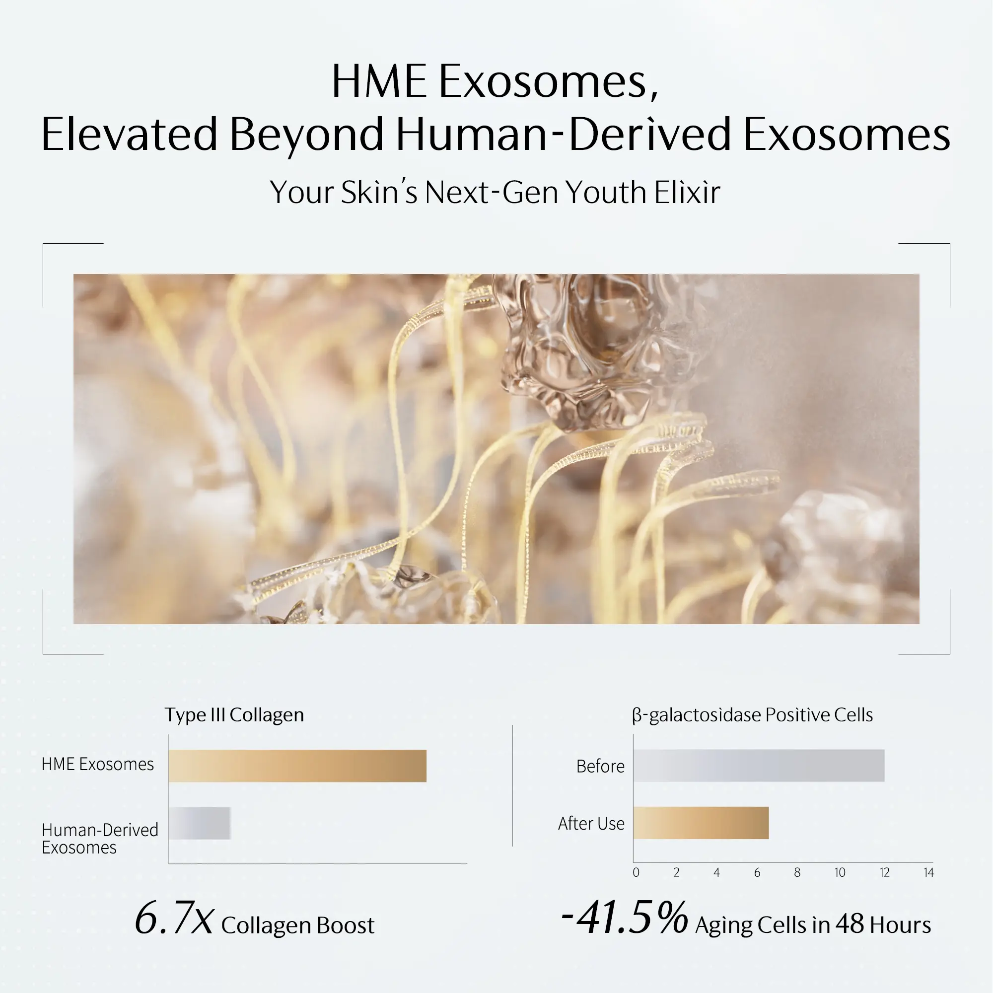• Enhance Firmness & Lift (+29.39% Firmness, +7.56% Eyelid Lift): The HME Exosomes deliver a powerful 6.7X collagen boost (specifically targeting Type III Collagen), promoting skin plumpness and a visible lifting effect, reducing aging cells by -41.5% in 48 hours.