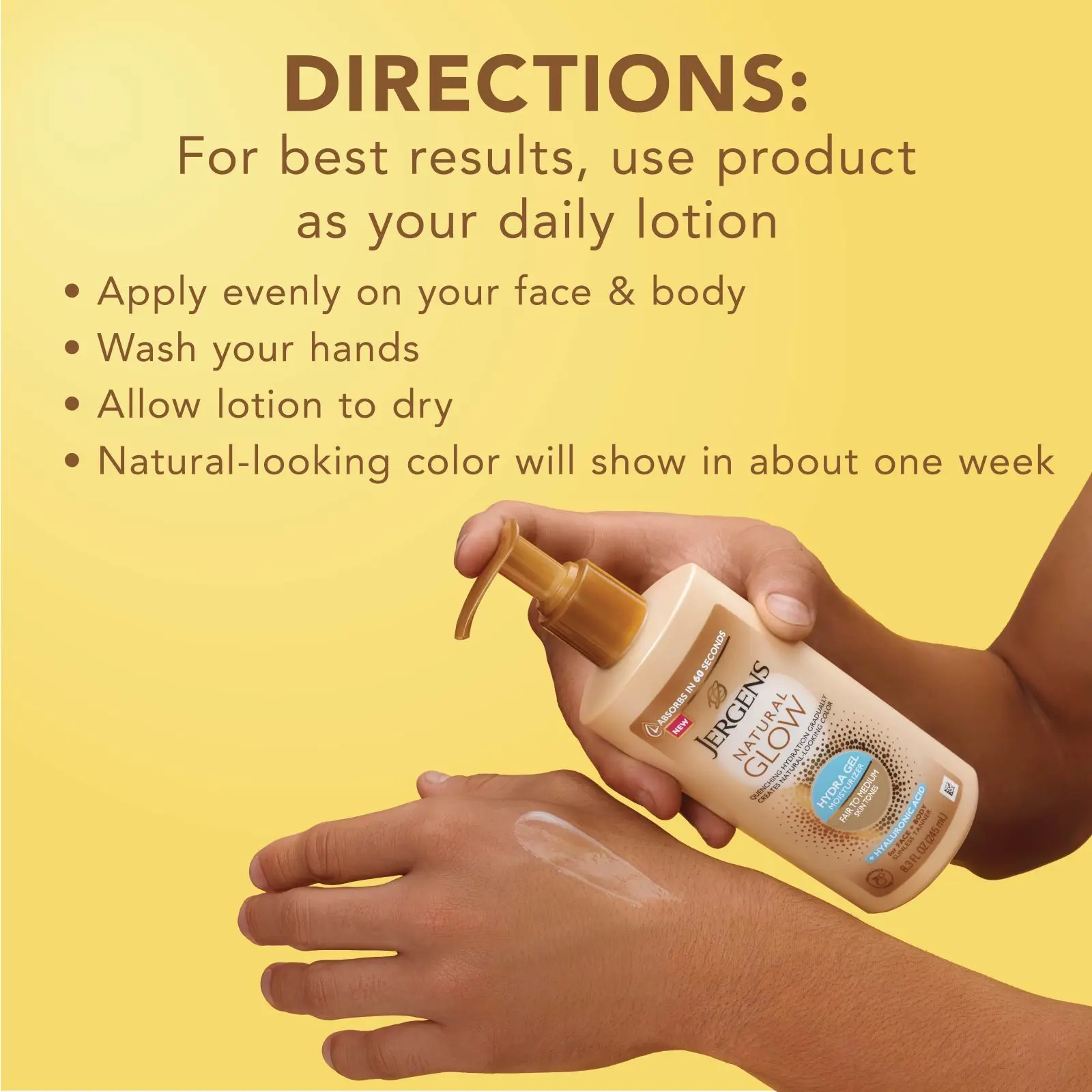 Achieve a sun-kissed glow that develops gradually. The formula gives you a streak-free, even glow. For best results, use daily. Smooth on evenly and completely. Try sparingly on elbows, knees, ankles, and around facial hair.