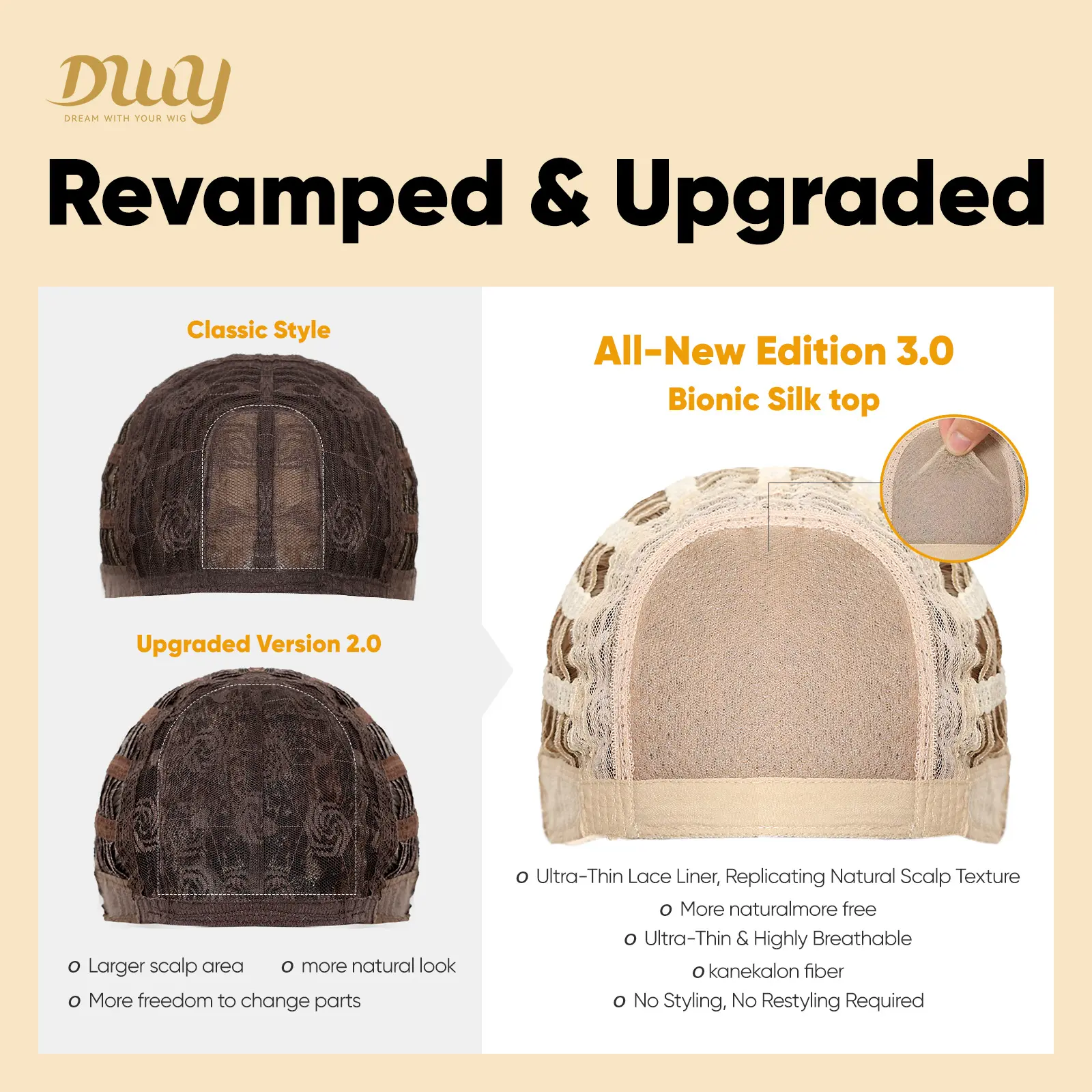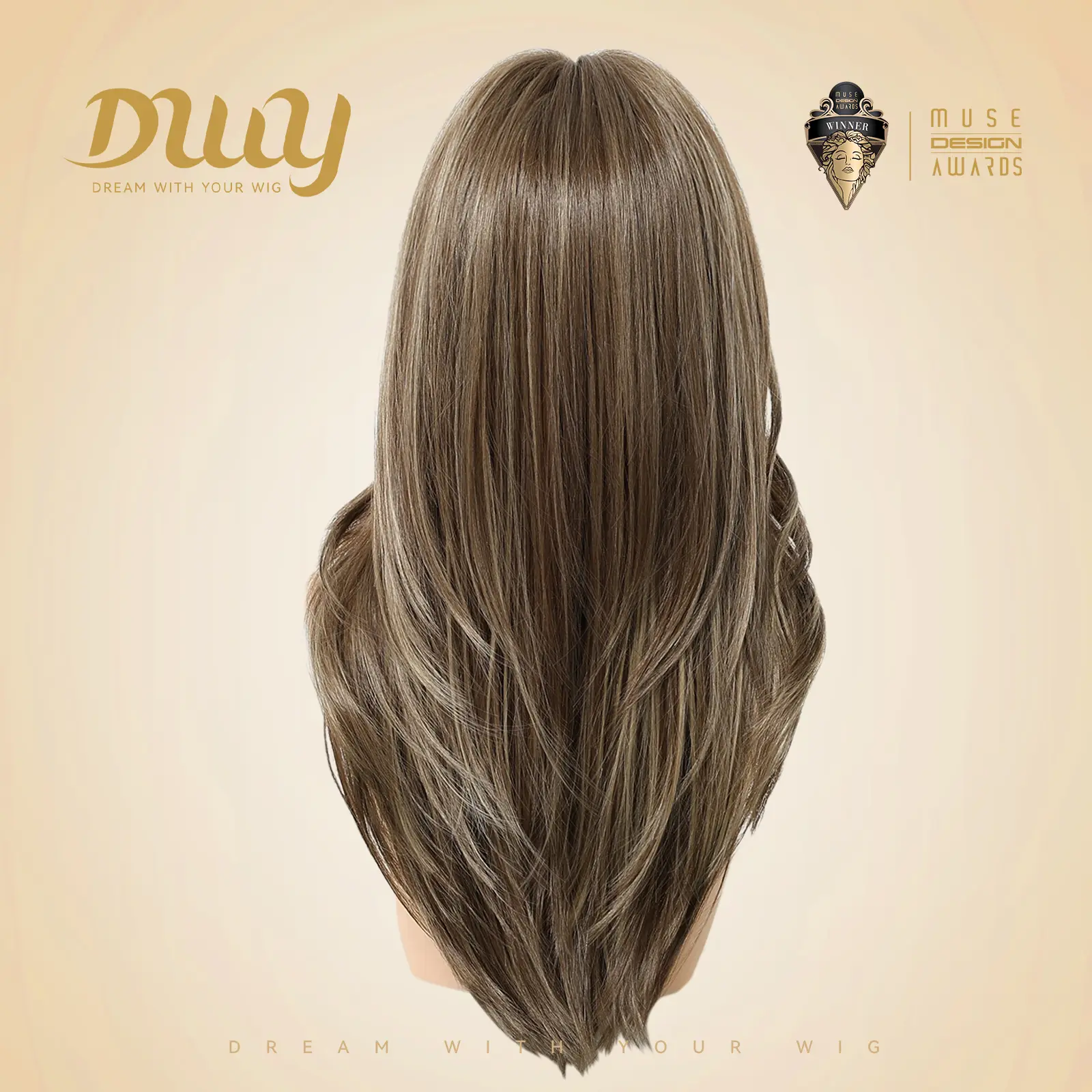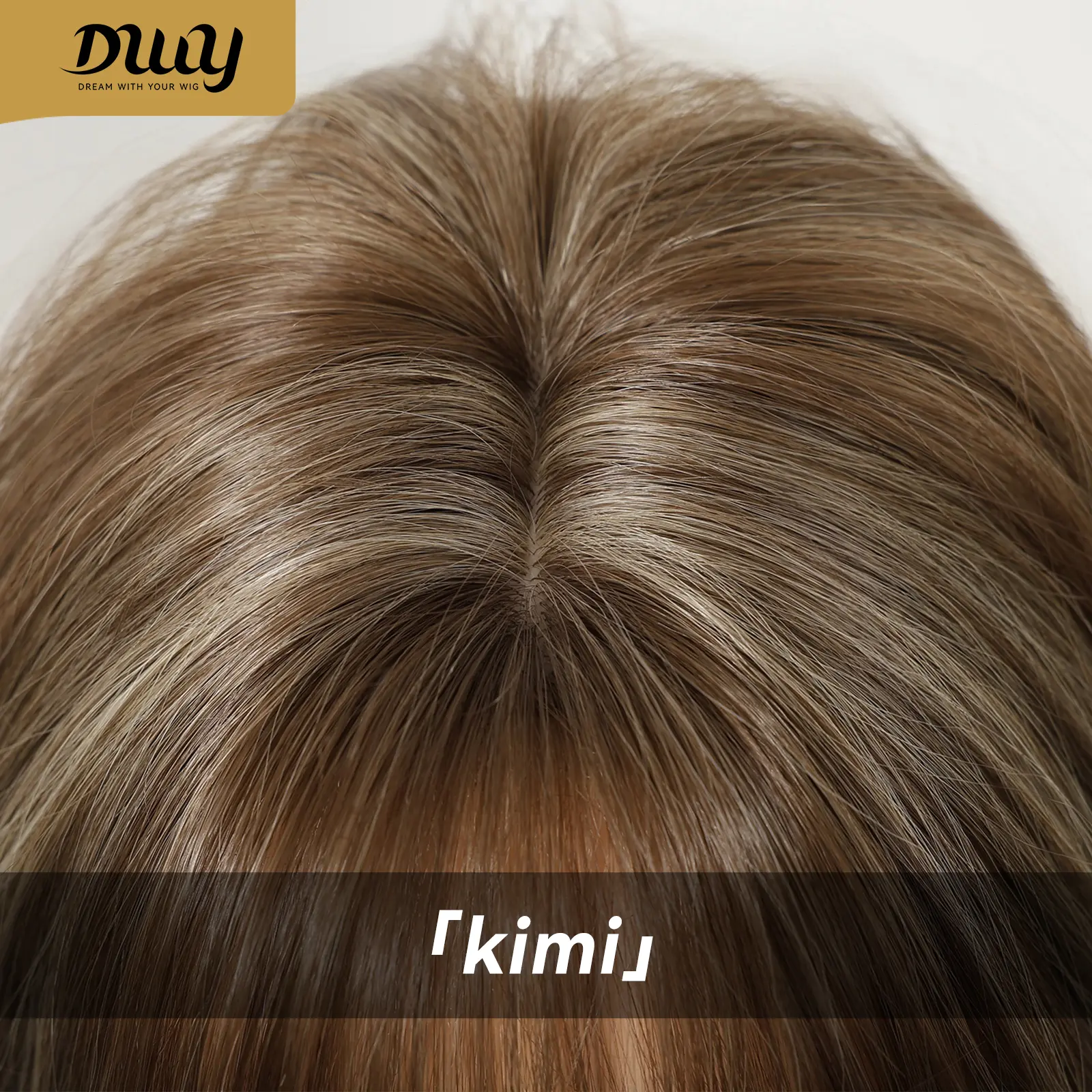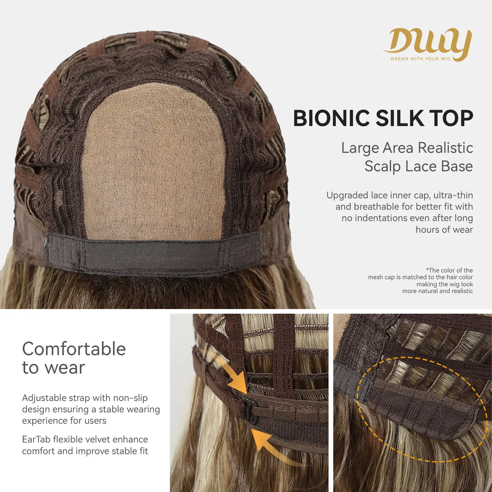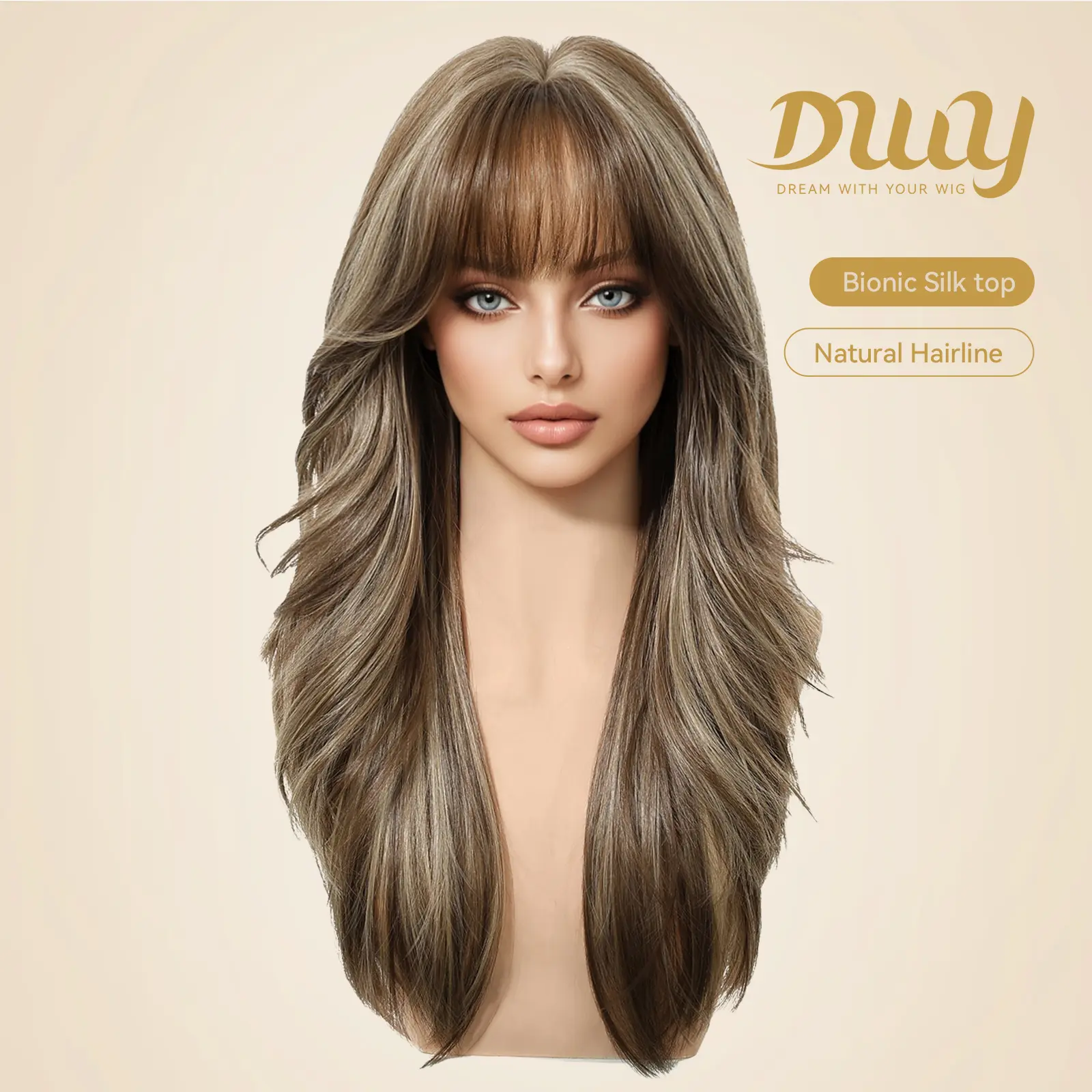 Kimi C-DWY New Technology! Bionic Silk Top 22-Inch Long Wave Light Brown Glueless Synthetic Wig with Bangs for Women