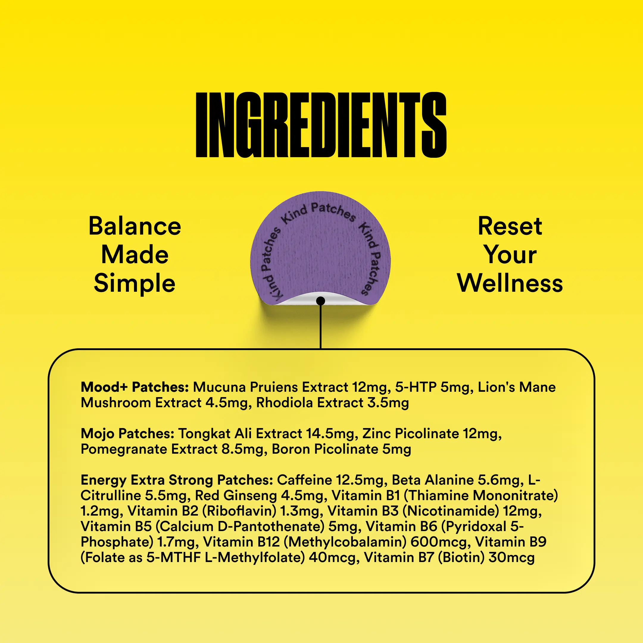 Energy Patches Extra Strong: Our Extra Strong Energy Patches provide 12.5mg of caffeine, 5mg of red ginseng for sustained vitality, and Vitamin B12 for energy support. Designed with gradual release for up to 8 hours of continuous energy, these patches help you stay focused throughout the day.Â