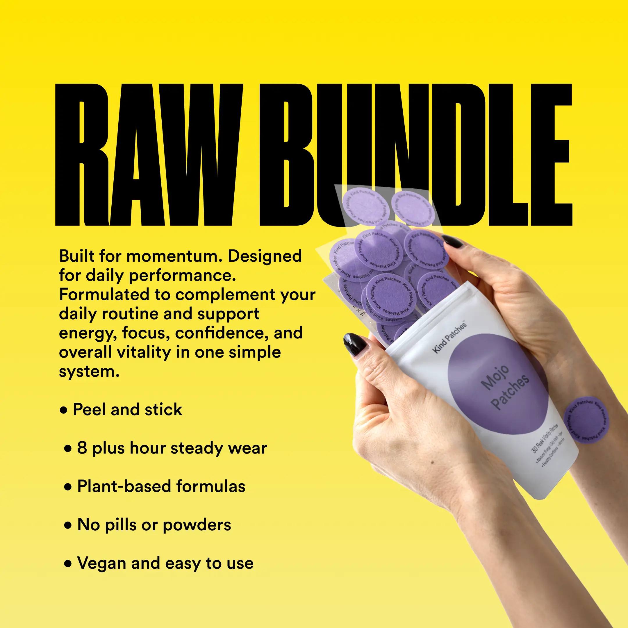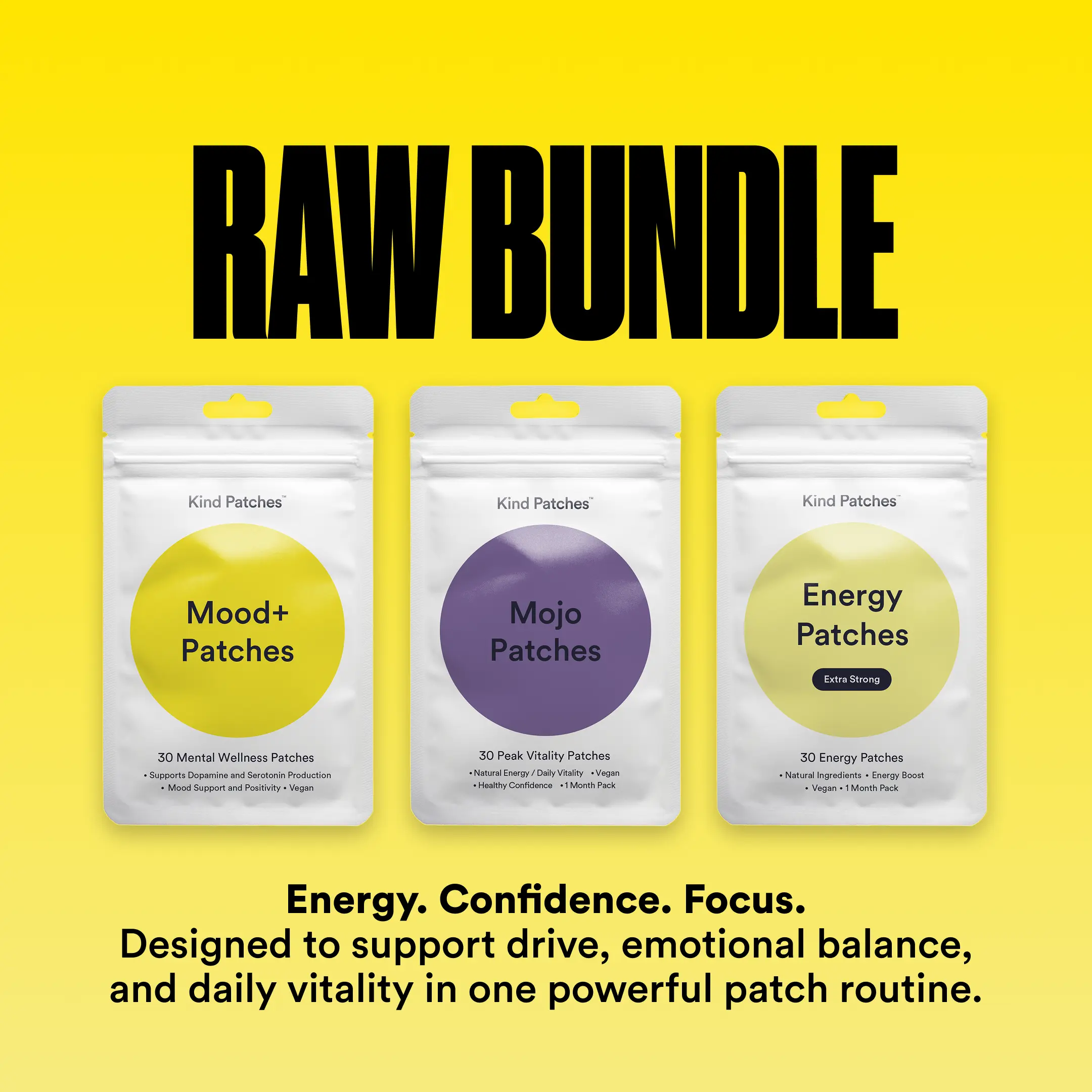 Raw Bundle: This bundle combines Mood+ Patches, Mojo Patches, Energy Patches ES into a three-pack set designed to support both emotional well-being and help you feel more alive by supporting your drive, desire, and confidence. The synergy of these three products creates a holistic solution for consumers seeking upgrade in mood and energy, strength, and vitality throughout their day.