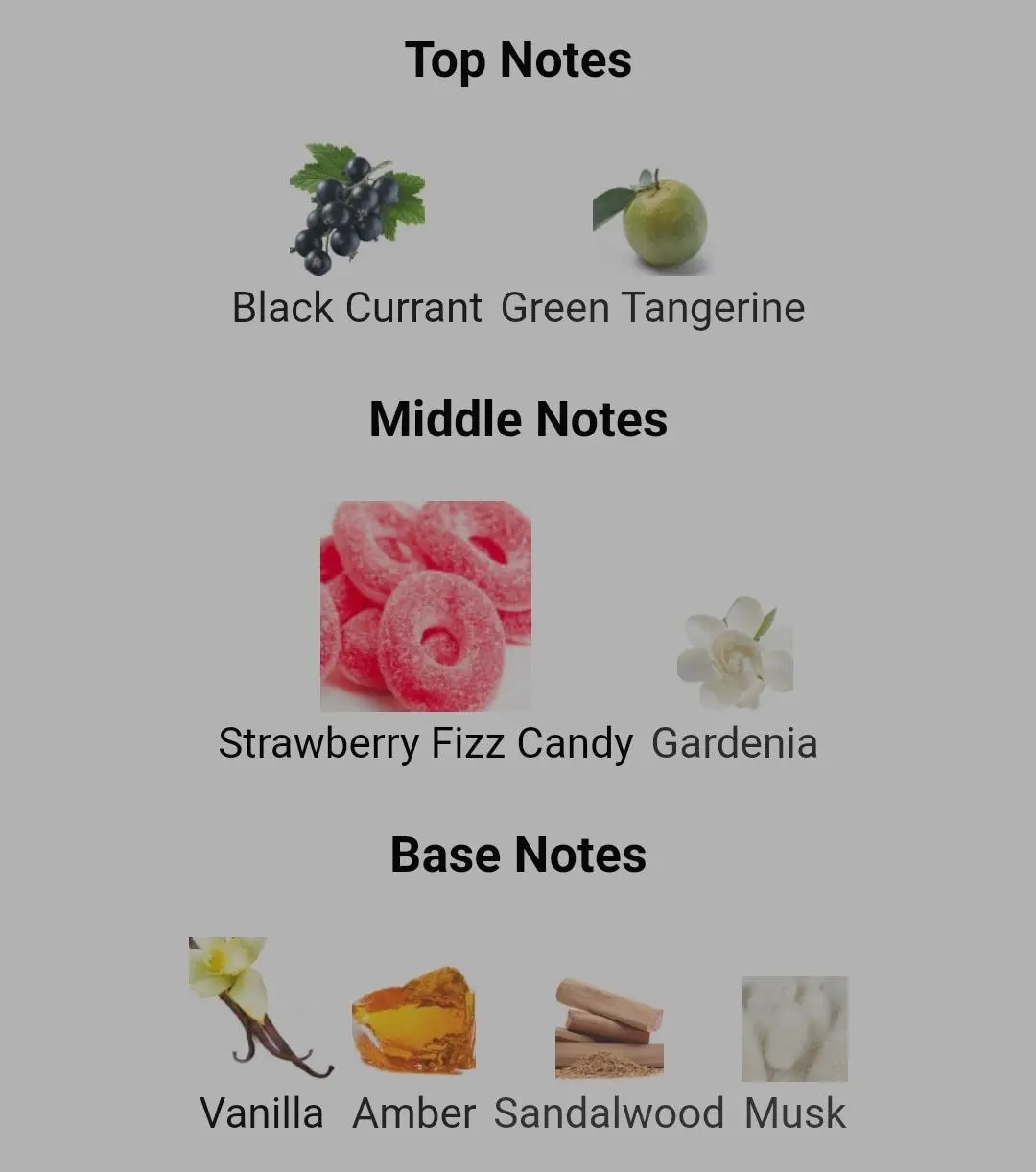 - Top Notes: Green mandarin and strawberry fizz for a bright, fruity opening.