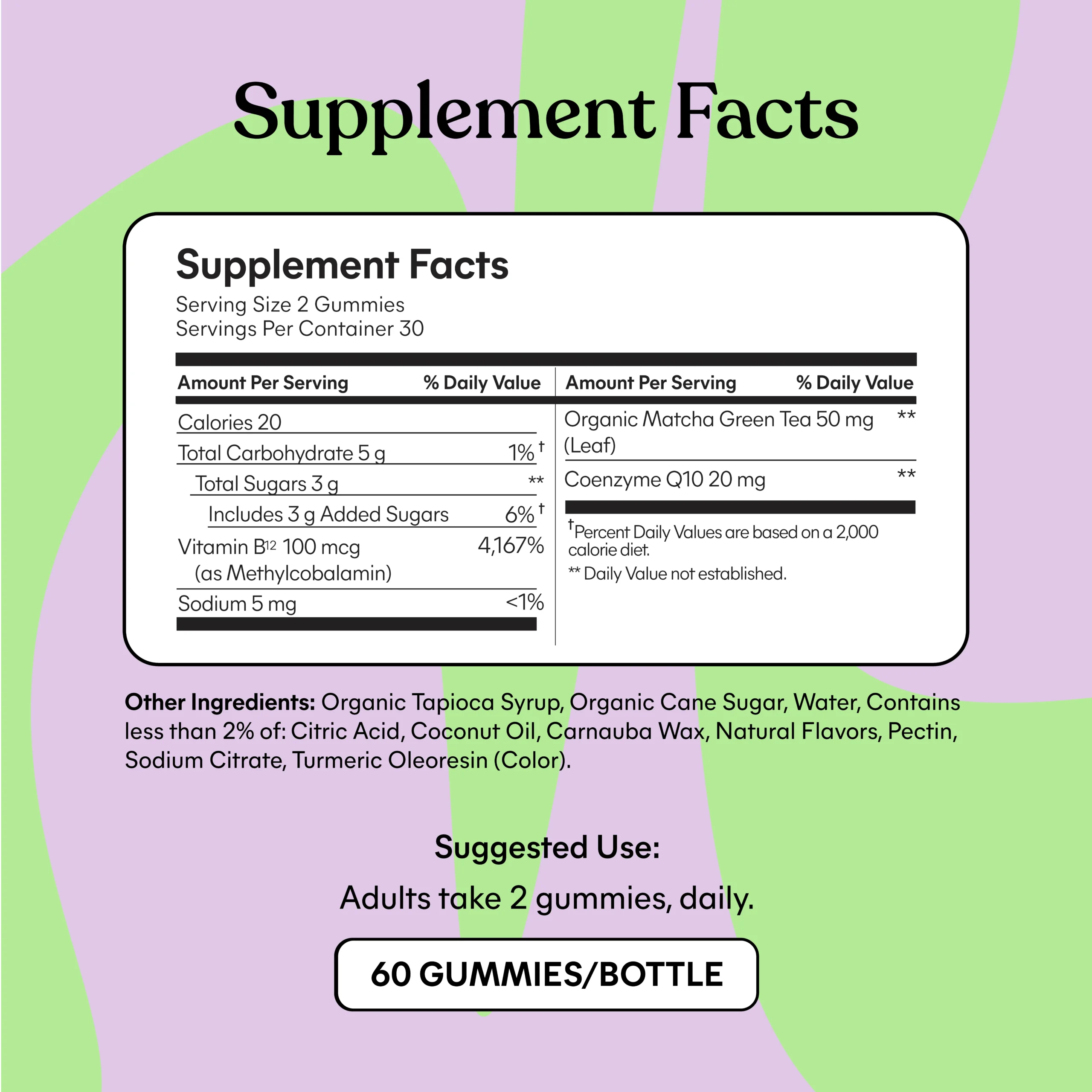- Ingredients: Organic Matcha Green Tea, Coenzyme Q10 (Ubiquinone), Other Ingredients: Organic Tapioca Syrup, Organic Cane Sugar, Water, Contains less than 2% of: Citric Acid, Coconut Oil, Carnauba Wax, Natural Flavors, Pectin, Sodium Citrate, Turmeric Oleoresin (Color).