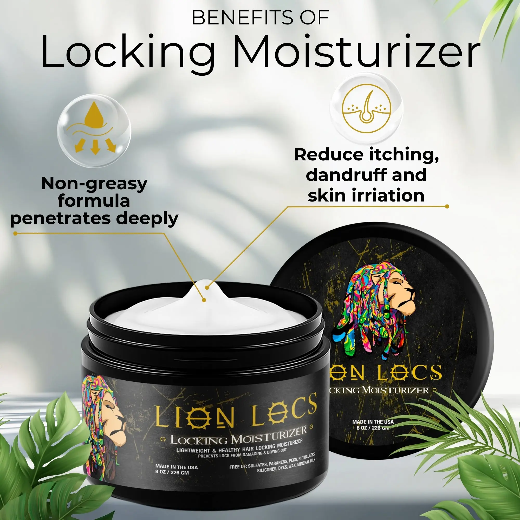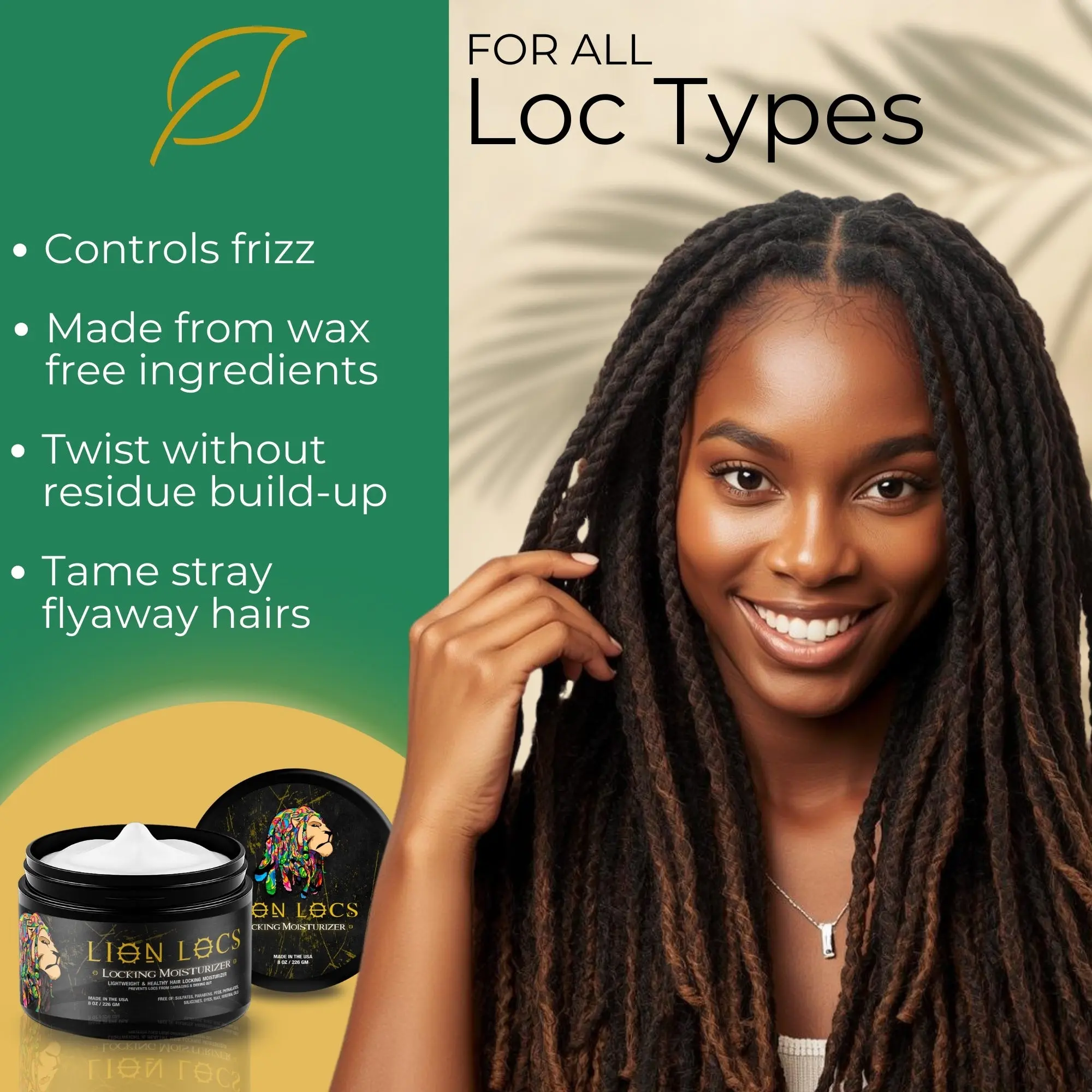 Lion Locs Gel Moisturizer (8oz or 2oz) is a lightweight, residue-free moisturizing gel designed for various loc styles. It aims to moisturize, retwist, and tame locs without leaving debris, build-up, or flakes. Suitable for all loc and hair types, our formula is cruelty-free, and free from silicones, sulfates, phthalates, alcohol, parabens, and other nasty over the counter chemicals.