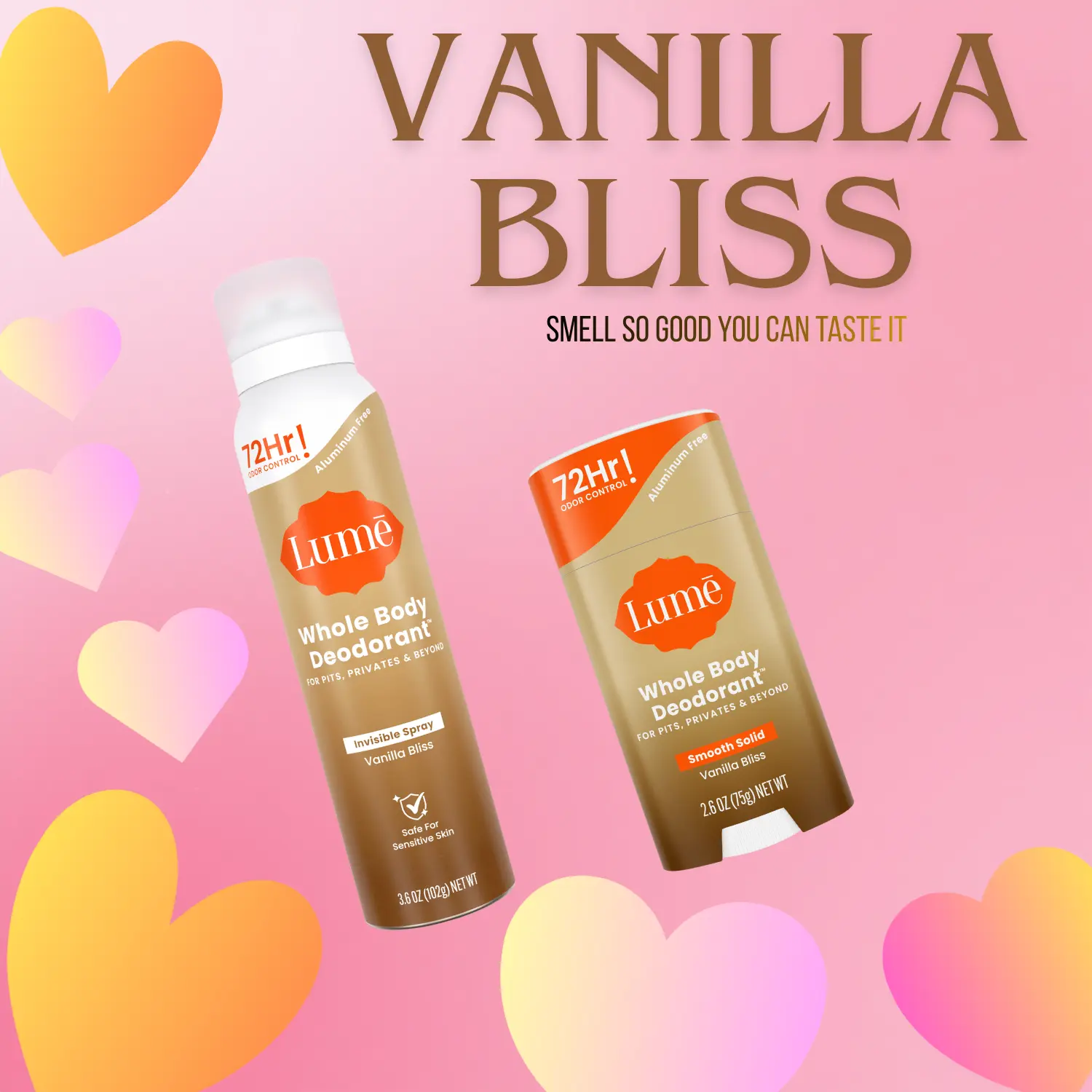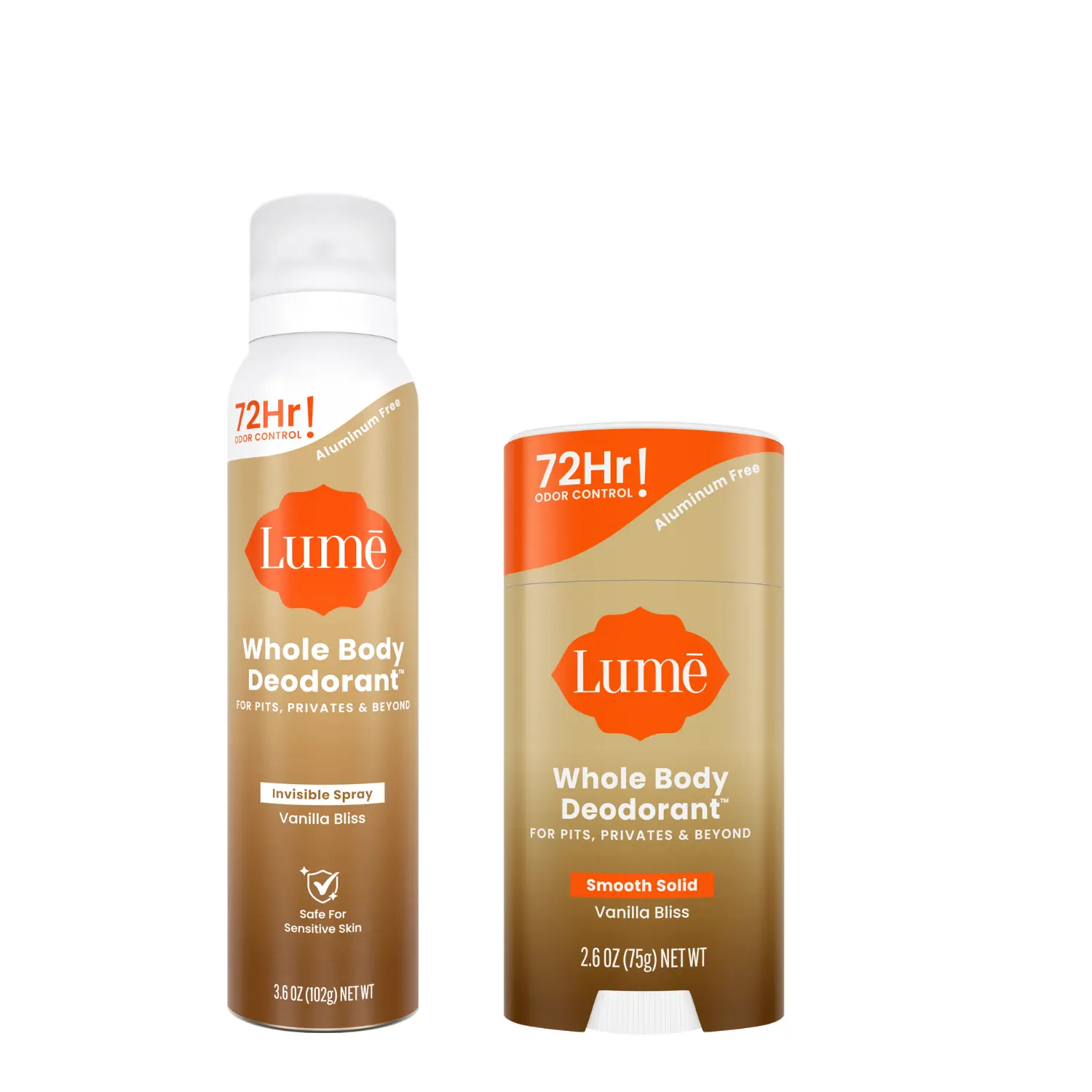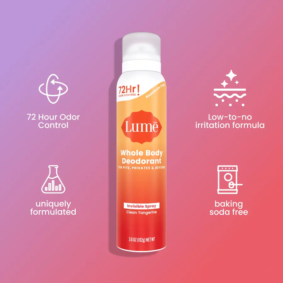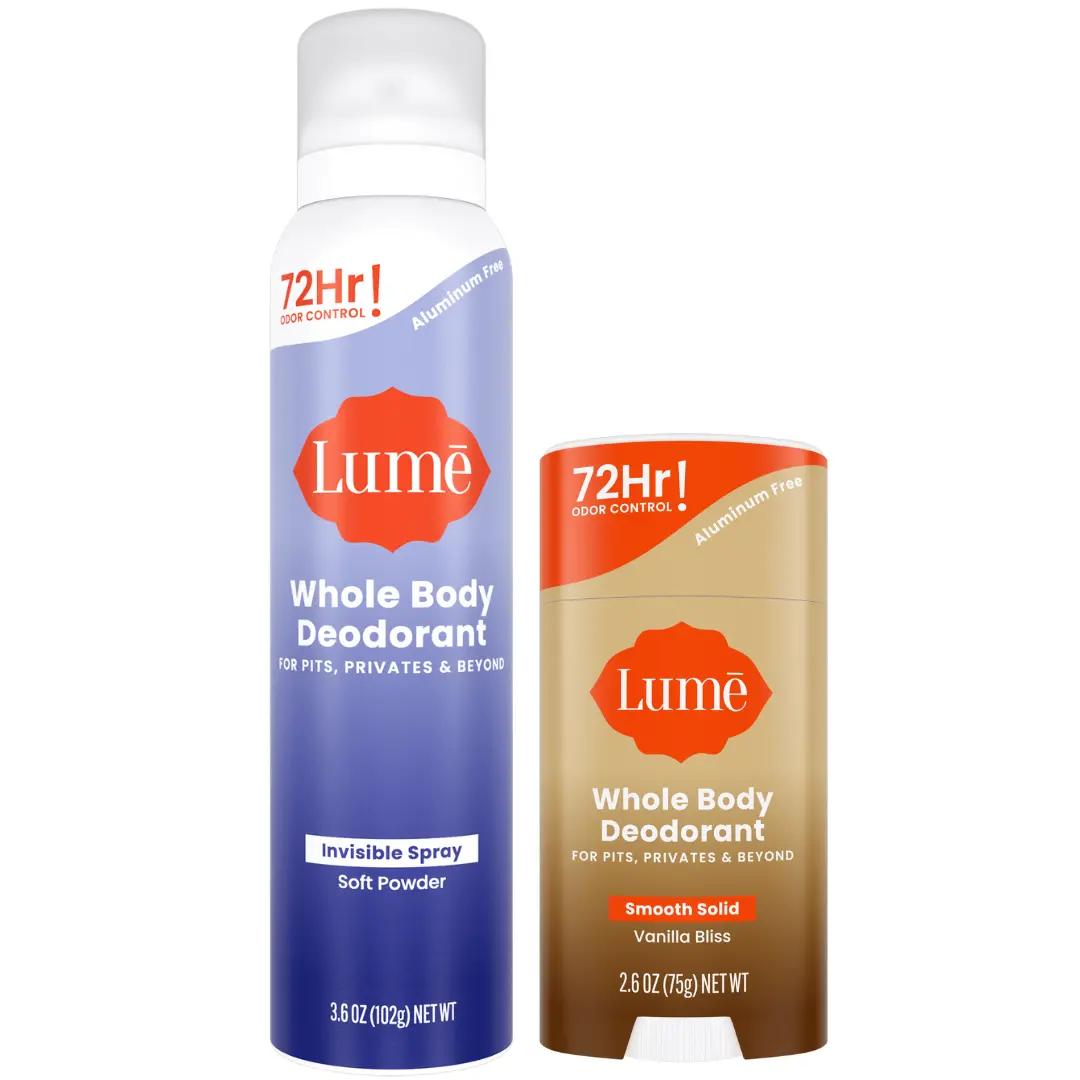 Lume aluminum-free whole body deodorant combo pack. OBGYN-developed solid stick and spray with 72-hour odor control for underarms, feet, and everywhere in between.