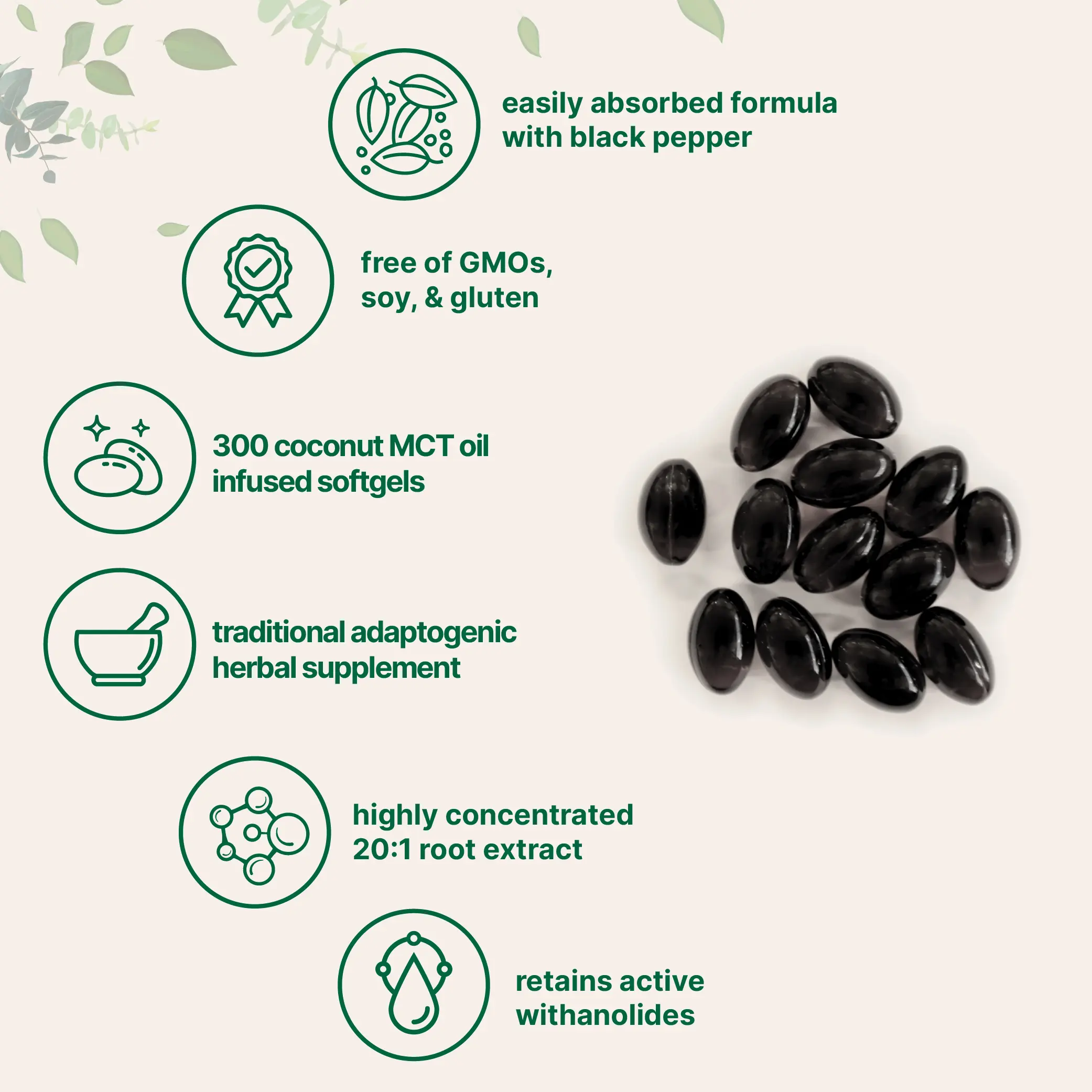 • Each pouch contains 300 softgels with 150 servings. Delivers a 6,000mg serving of Ashwagandha as Withania Somnifera combined with Black Pepper and Coconut MCT Oil.