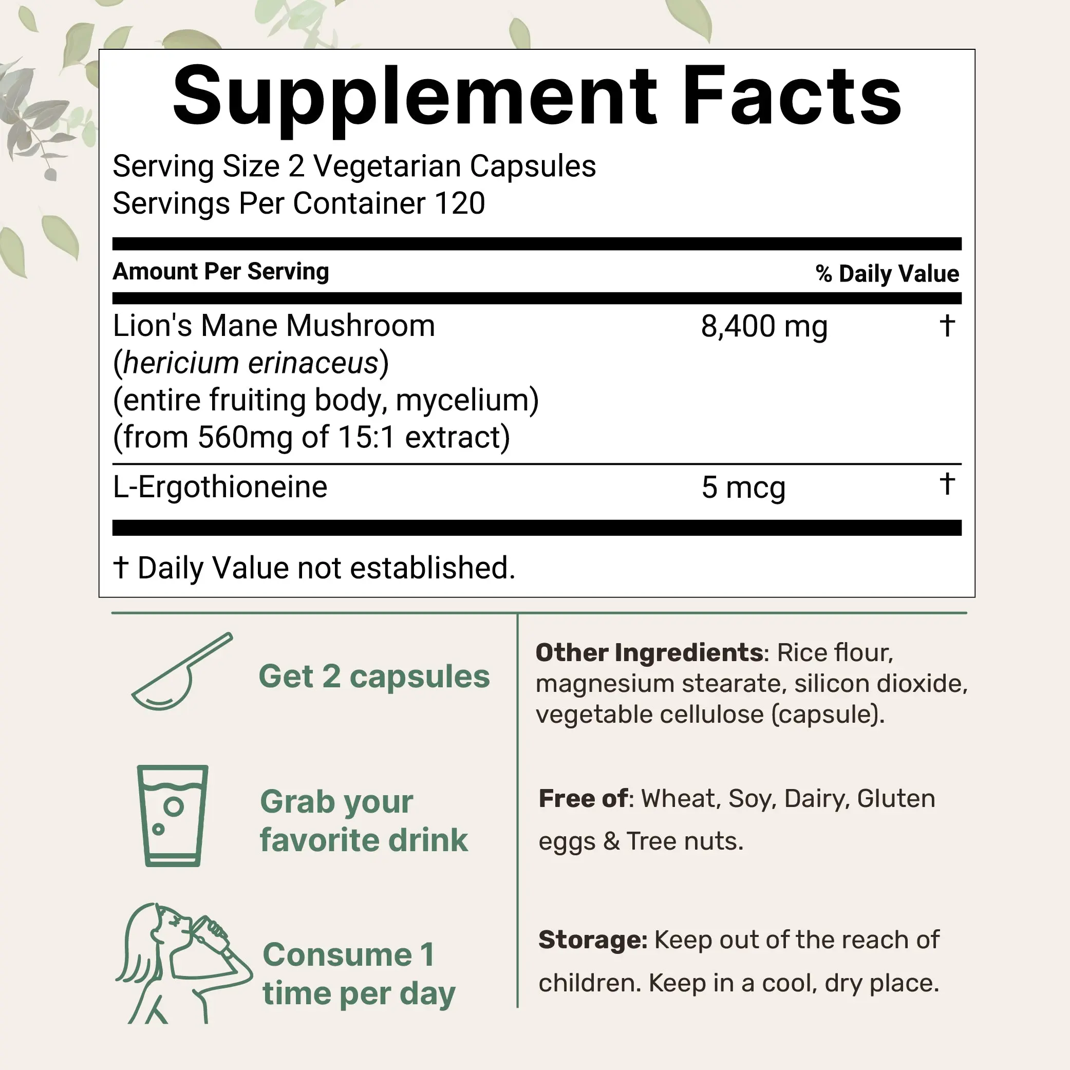 • Each bottle contains 240 vegetarian capsules, 2 veg capsules serving size provides 8,400 mg lion’s mane herbal equivalent and 5 mcg L-ergothioneine, 120 total servings.
