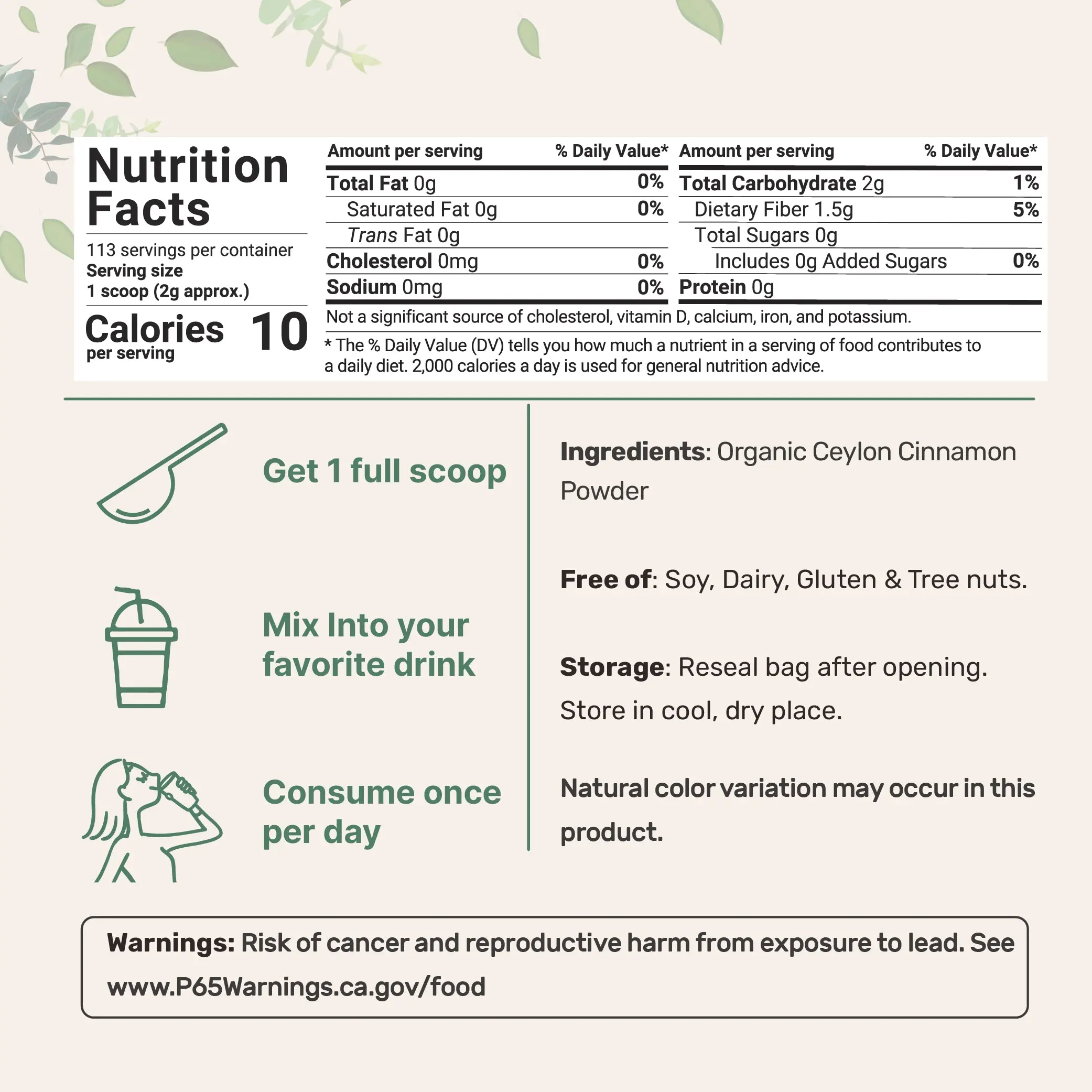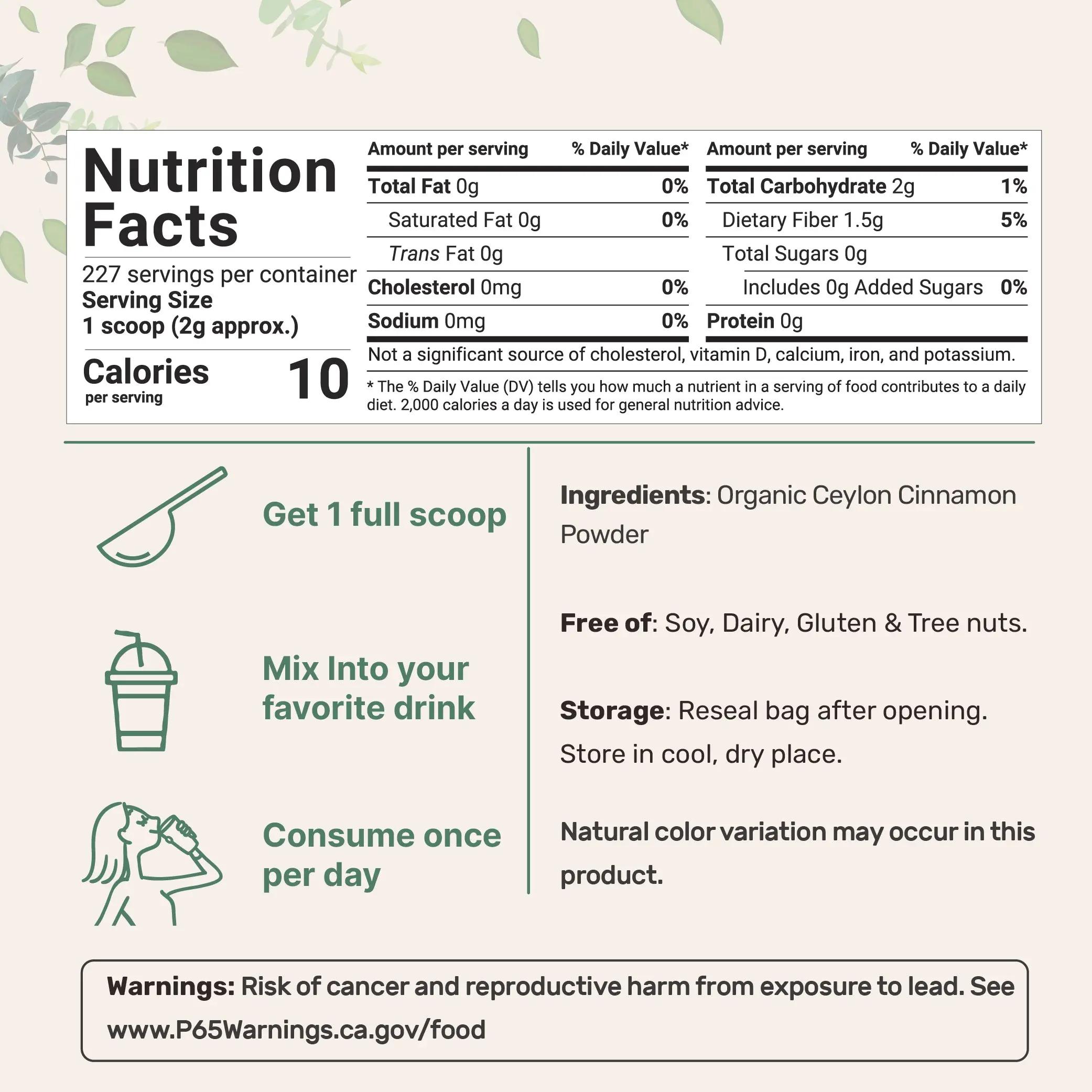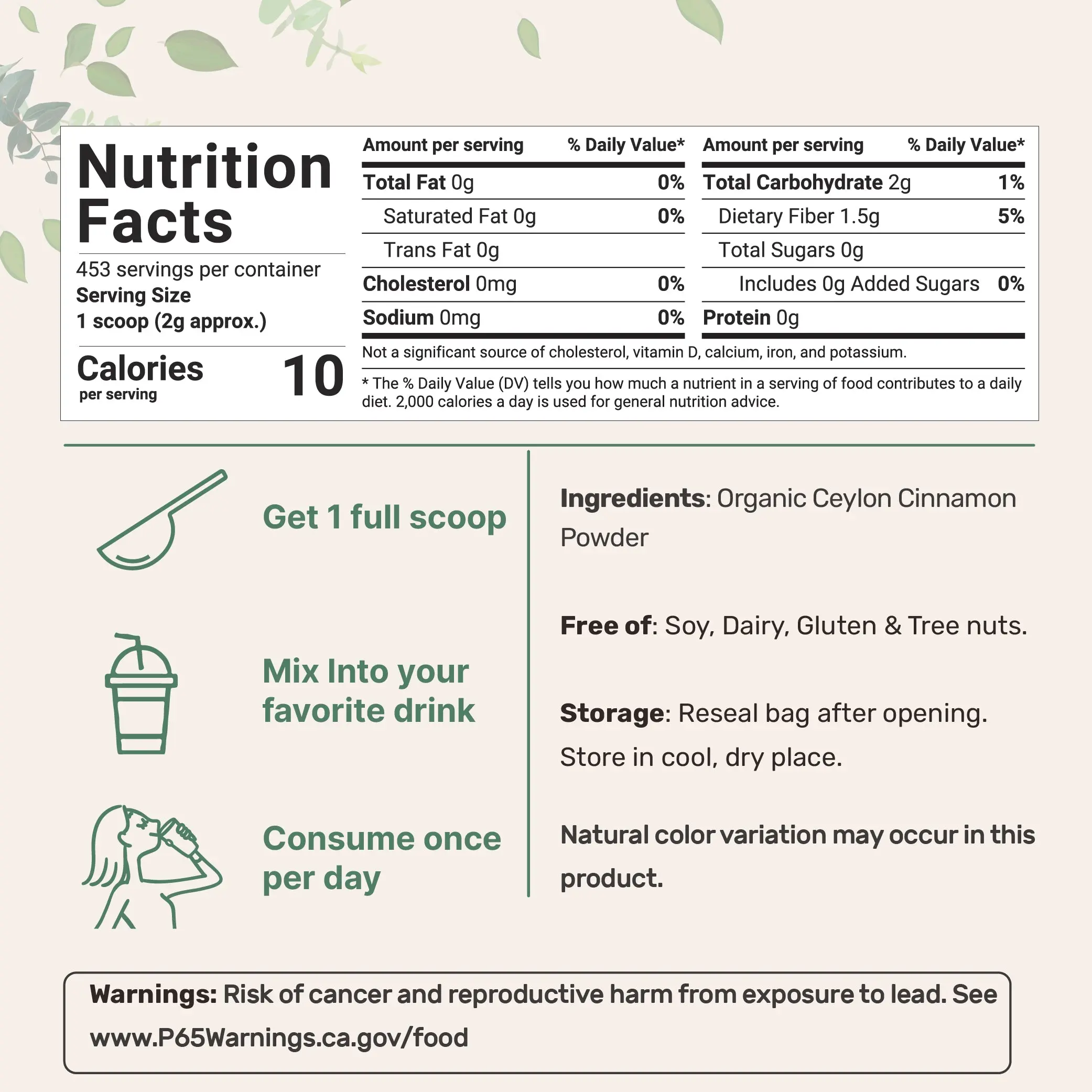 Each pouch provides 2 lbs / 1 lb / 8oz of authentic cinnamon with every scoop containing 2g. That’s a 453-day (or 227-day) supply of this essential spice that is perfect for any cooking or baking needs.