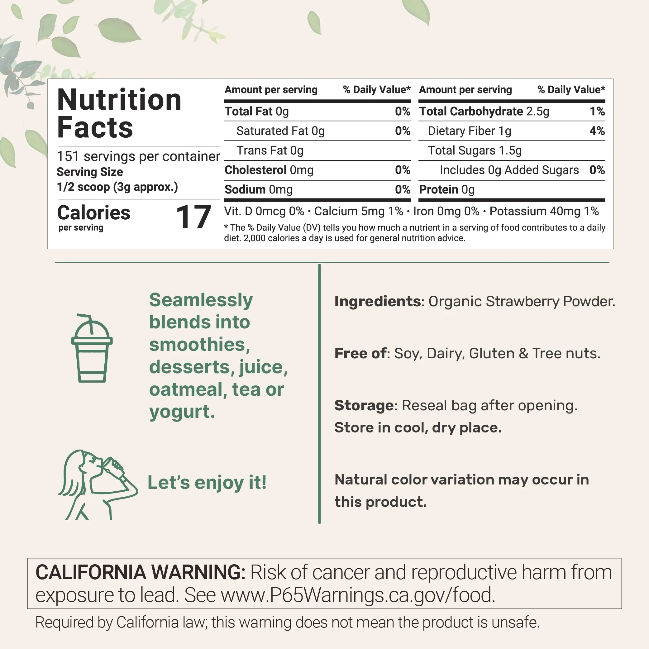 • Each pouch contains 1 pound of organic freeze-dried strawberry powder, ½ scoop serving size, delivers approx. 3g, lasts up to a 151-day supply.