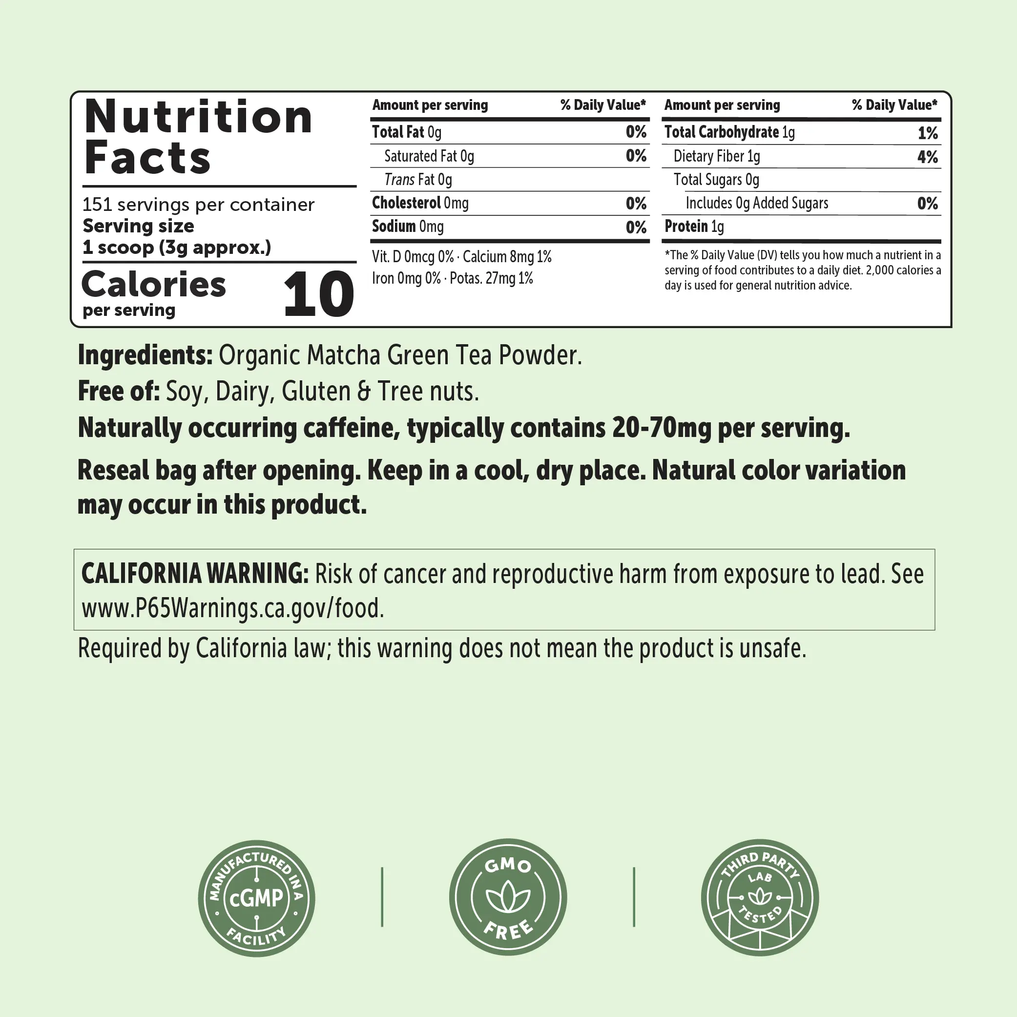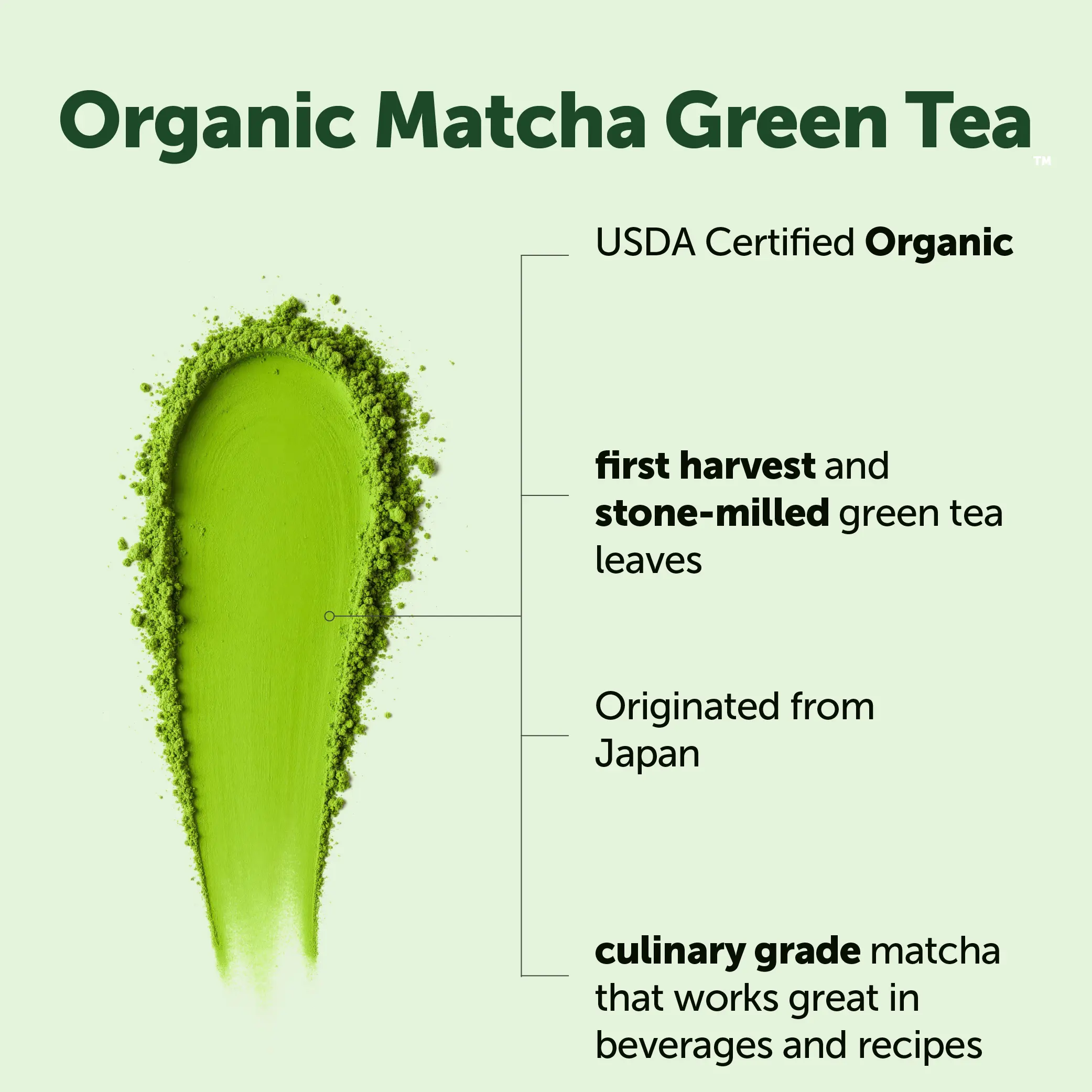 100% Organic Japanese Matcha Green Tea Powder (First Harvest, Culinary Grade). Shade-grown leaves boosted with chlorophyll and L-Theanine during growth, then stone-ground into a fine powder. Naturally rich in EGCG (epigallocatechin gallate), L-Theanine, natural caffeine (70mg/serving), chlorophyll, Vitamins C, A, and K, and trace minerals. Unflavored, unsweetened, and free from fillers, additives, soy, dairy, and gluten.