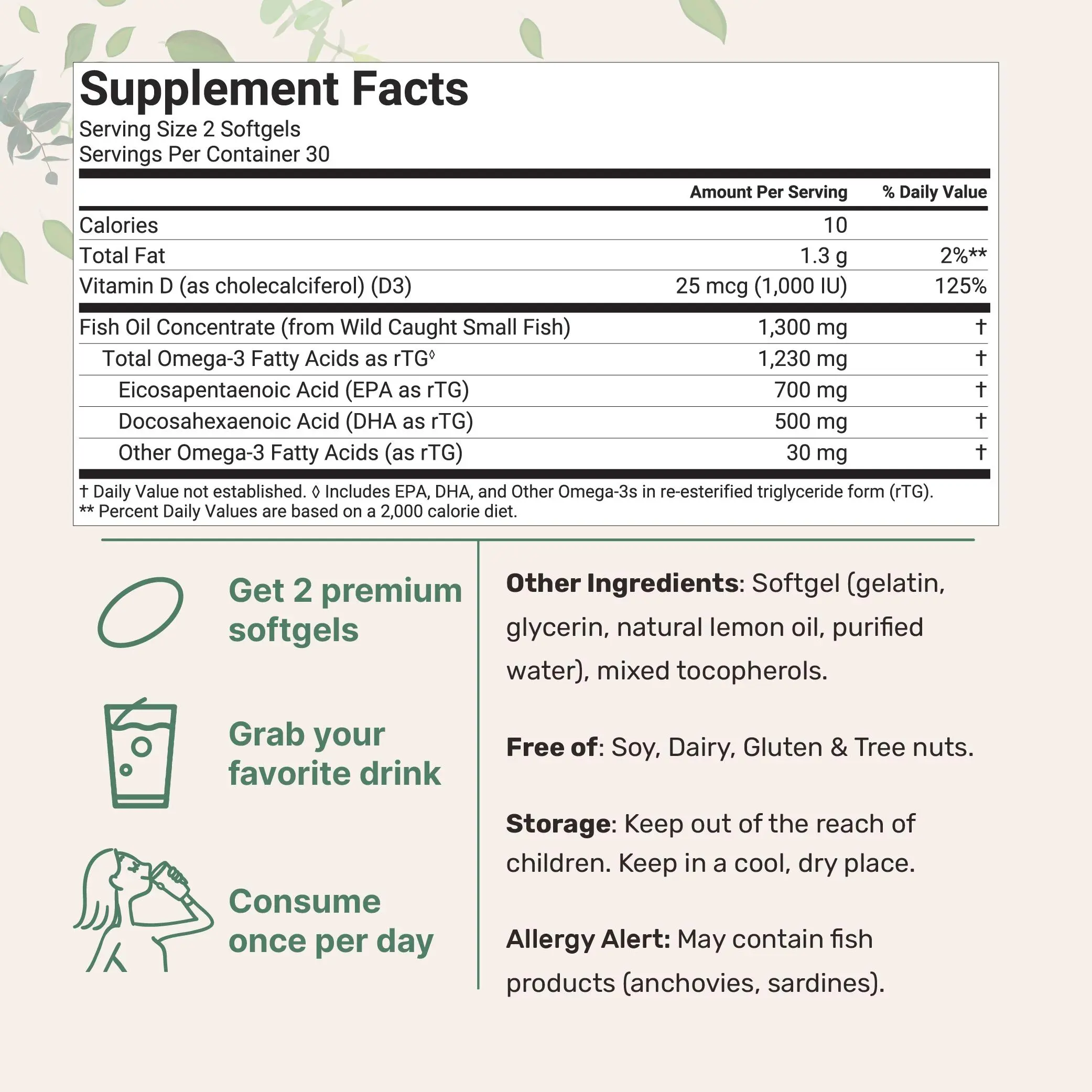Our Supreme Omega-3 Fish Oil Softgels are formulated with vitamin D3. Each serving delivers 1,300 mg fish oil concentrate, including 700 mg EPA and 500 mg DHA in rTG form for superior absorption.