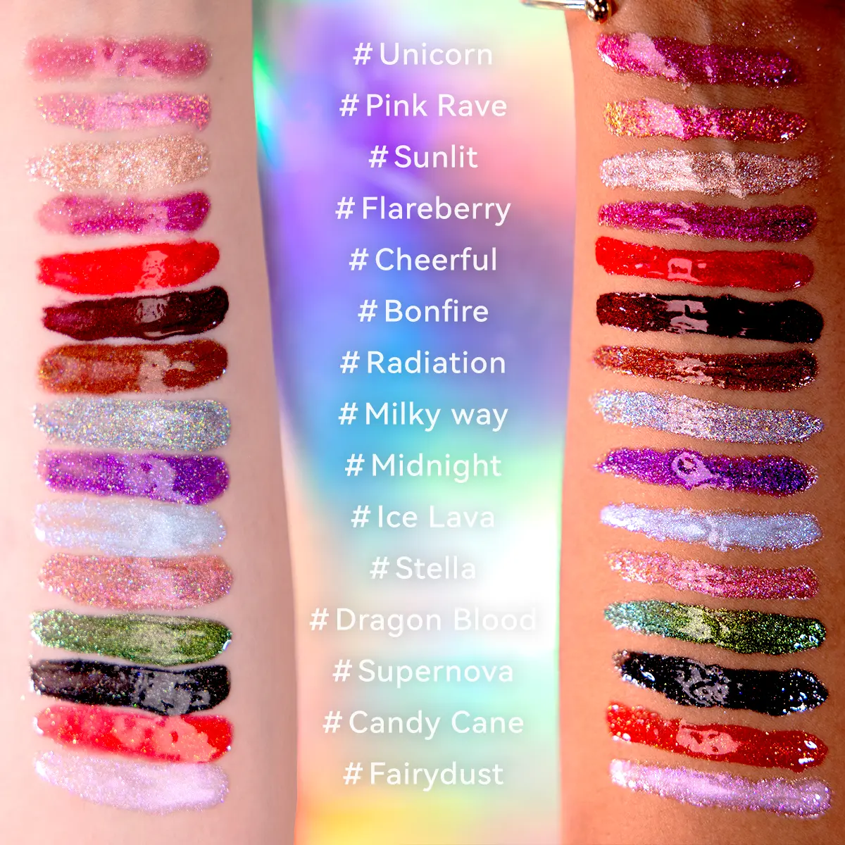Tired of Choosing between a dazzling shine and comfortable wear? Our ultra-glitter liquid lip gloss delivers an explosive, 3D prismatic shine, it also provides you with the best hydrating experience to your lips. Get ready for a lip look that’s as radiant as it is nourished.