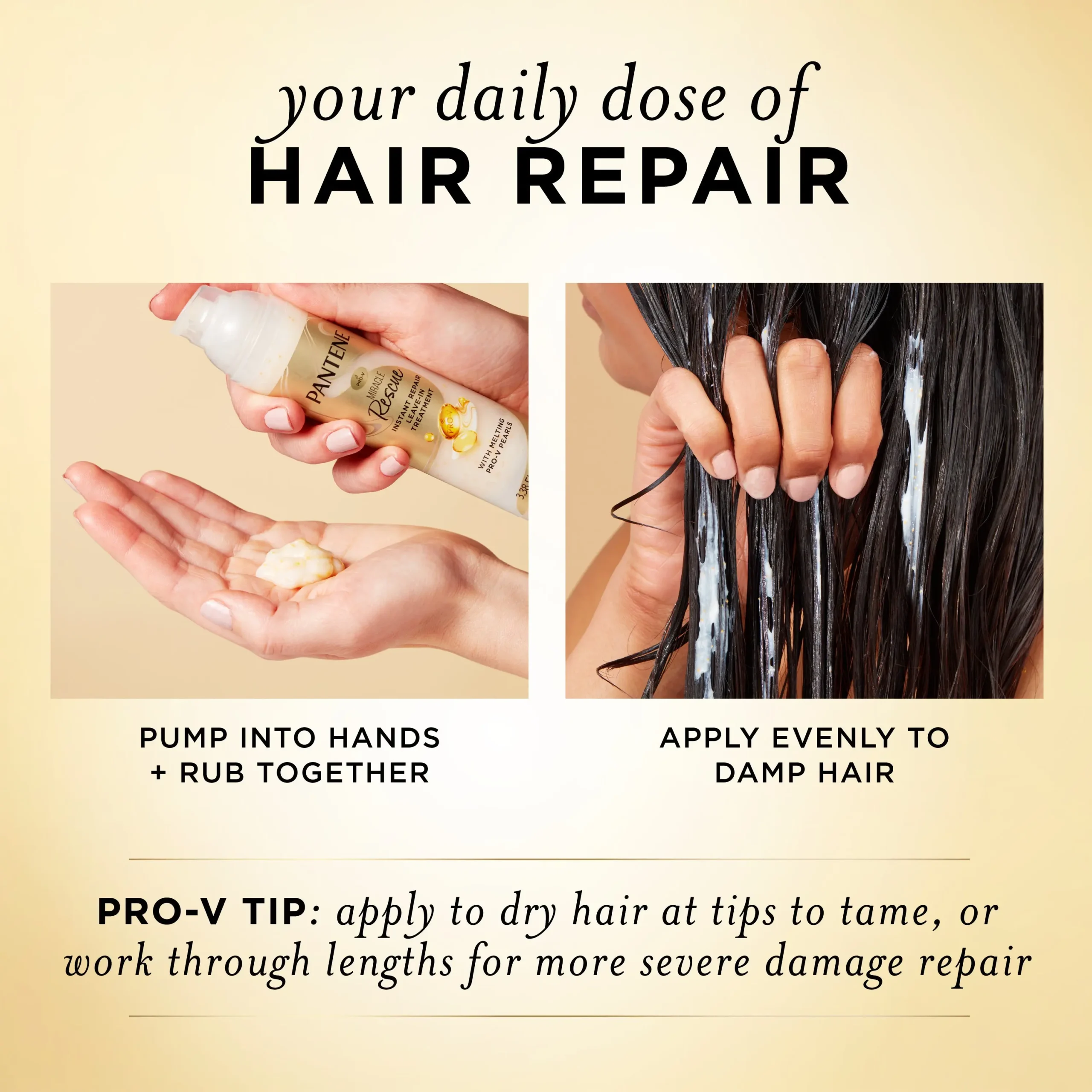 Pantene Miracle Rescue Instant Repair Leave-In Treatment is your go-to styling ally that undoes months of damage whenever and wherever your hair needs it. Powered by Melting Pro-V Pearls, the lightweight formula dissolves as you mix it in your hands and penetrates deep into the hair fiber, repairing damage after just one use.