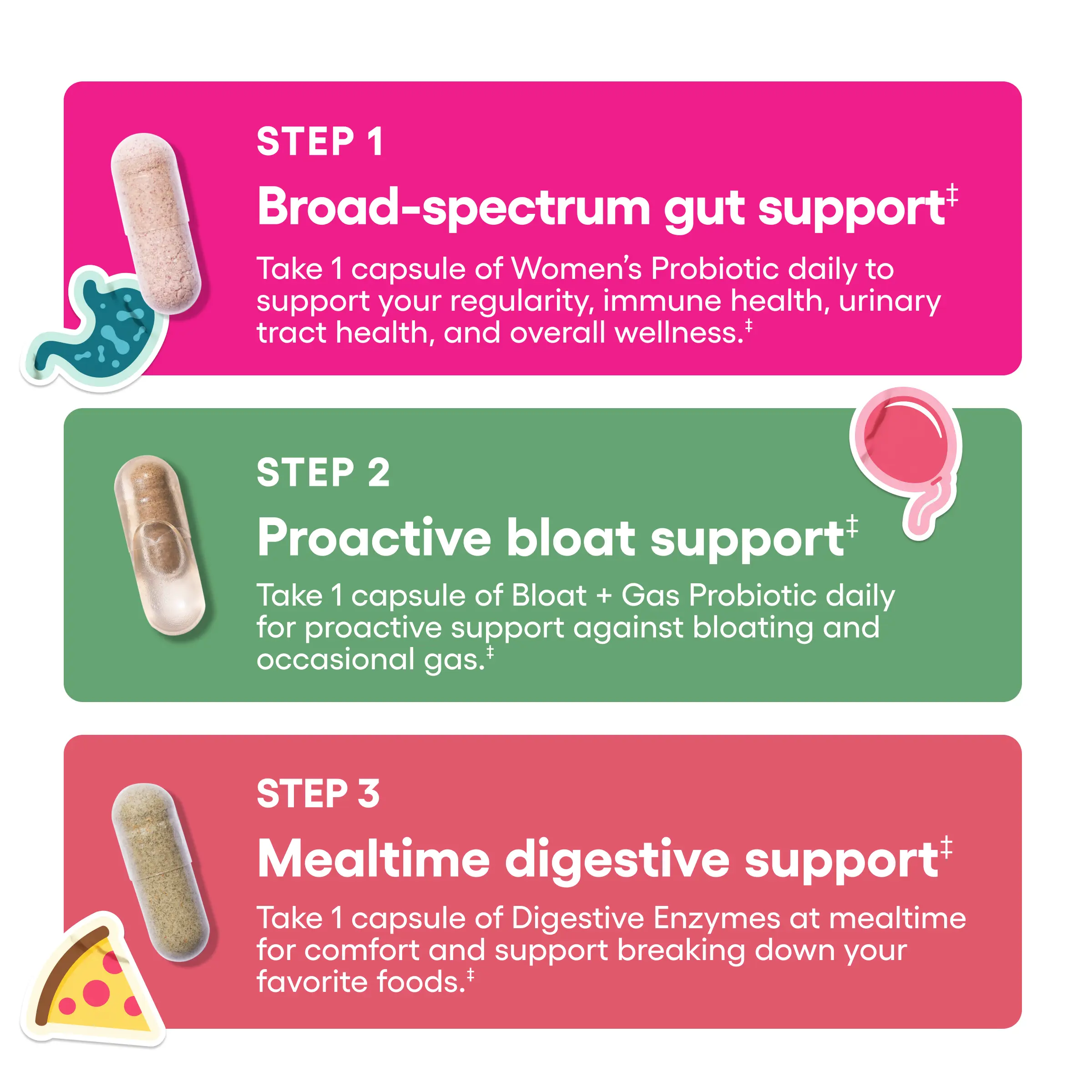 One Month Supply: 30 count Women’s Probiotic + 30 count Bloat & Gas Probiotic + 60 count Digestive Enzymes
