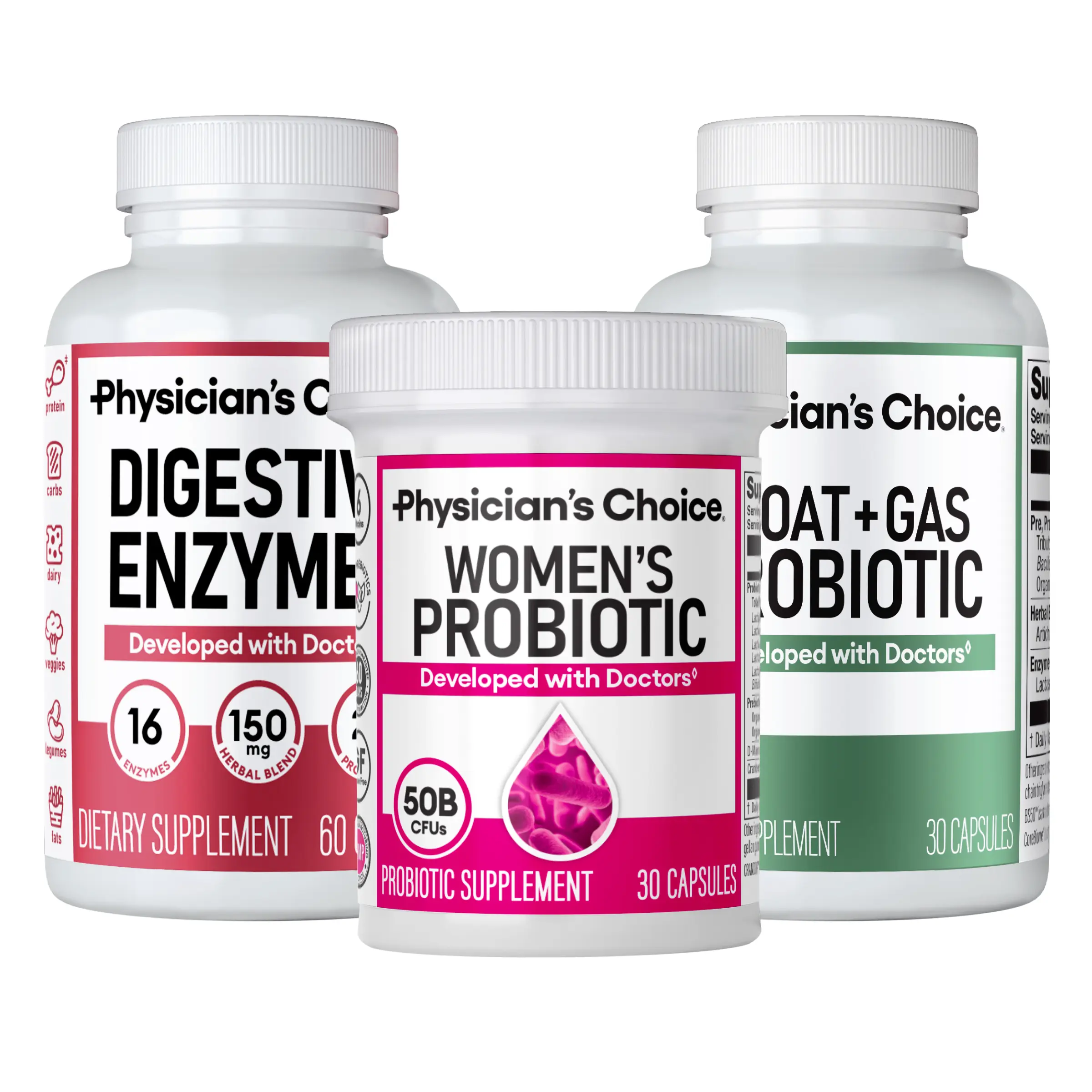 Physician’s Choice Gut Goddess Bundle: A trio of gut support specifically combined to support women’s microbiomes! Our Women’s Probiotic, Bloat & Gas Probiotic, and Digestive Enzymes work together for digestive balance and mealtime comfort.