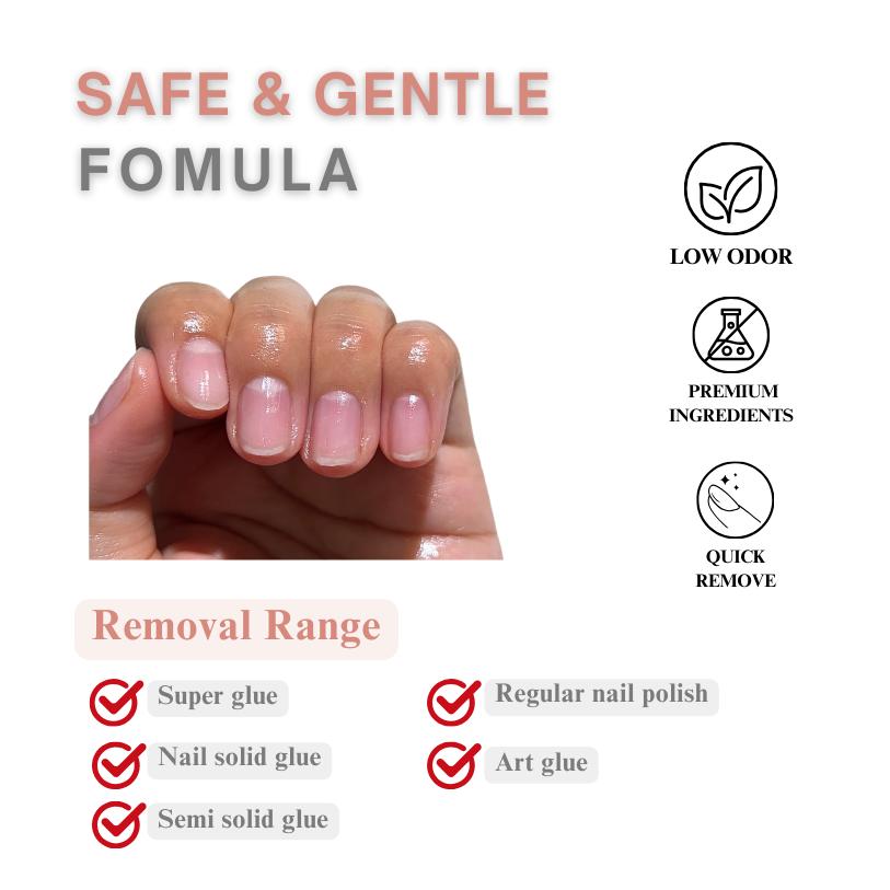 • Residue-Free and Healthy Nails: Effectively removes both press-on nails and any residual nail glue without leaving behind damaging residues, thanks to its acetone-free and cruelty-free formula that promotes nail hydration and health.