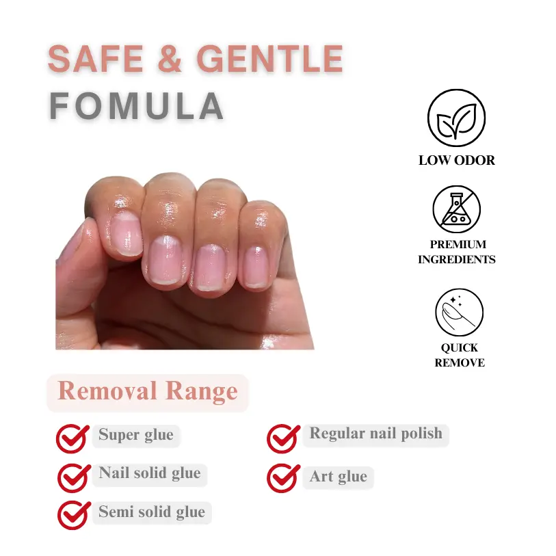 • Residue-Free and Healthy Nails: Effectively removes both press-on nails and any residual nail glue without leaving behind damaging residues, thanks to its acetone-free and cruelty-free formula that promotes nail hydration and health.